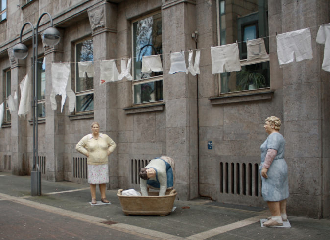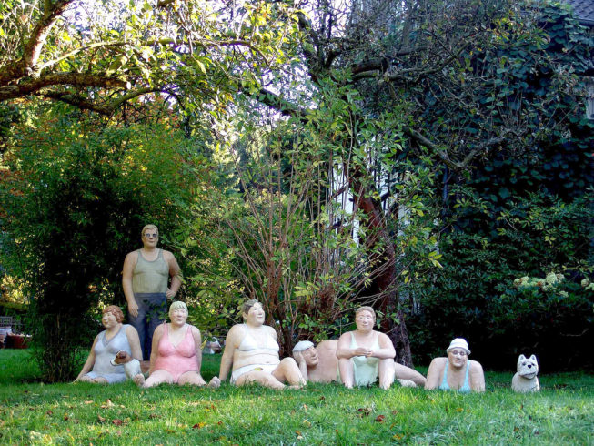 Das gelebte Leben ist es, das die Wittener Künstlerin interessiert, und dabei sind es insbesondere die kleinen Momente des Alltags. Dafür nimmt sie ihre Mitmenschen mitunter genau in den Blick: „Manchmal sieht man besondere Typen und weiß sofort: Das ist authentisch!“ erklärt sie die Faszination ihrer Suche nach Augenblicken. Für solche Studien am Objekt hat sie in der Vergangenheit manches Mal auch Kritik ihrer heute längst erwachsenen Töchter einstecken müssen („Mama, starr doch die Leute nicht so an!“), und gelegentlich kam ihr auch der Zufall zur Hilfe: Etwa dann, wenn sie in einer Silvesternacht festlich gekleidete Menschen am Nachbartisch beobachten konnte. Mit Papierhütchen auf dem Kopf begrüßten sie fröhlich das neue Jahr – und Monate später war dank dieser unverhofften Inspiration die neunköpfige Gruppe „Der Ernst des Lebens“ vollendet. Die Künstlerin lässt ihre Skulpturen eine heitere Polonaise tanzen oder den freien Stuhl suchen bei der „Reise nach Jerusalem“, platziert sie wohlig genießend auf Luftmatratzen oder zufrieden lächelnd auf Parkbänken. Ihre „Alltagsmenschen“ haben schon die gesamte Republik bereist, das Märkische Viertel und den Potsdamer Platz in Berlin besucht, waren in den Niederlanden zu Gast und auf der Art Karlsruhe. In ihrer Heimatstadt Witten kennt sie ohnehin jedes Kind – „mittlerweile sind sie in die heiligen Museumshallen eingezogen, besetzen die Innenstädte, bewohnen Parkflächen und Bürgersteige, erklimmen Dächer“ betonte Wolfgang Zemter, ehemaliger Direktor des dortigen Märkischen Museums.
