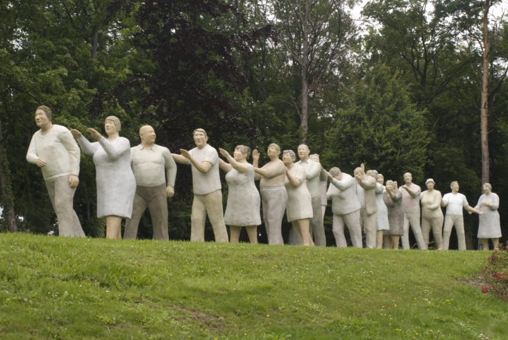 Das Team rund um Christel Lechner ist mit allen Arbeitsgängen vertraut, wenngleich jeder sein Spezialgebiet hat. Bei großen Aufträgen oder vielköpfigen Neuinszenierungen arbeitet die Künstlerin zuweilen mit einer überregionalen Crew. „An der Polonaise haben wir ein Jahr lang gearbeitet“, erinnert sie sich. Zahllose Skulpturen hat Christel Lechner seit den Anfängen wortwörtlich auf die Beine gestellt und sie mit ihrem Team zu ihren neuen Standorten etwa in Deutschland, Belgien, Frankreich, Österreich, Italien und in den Niederlanden begleitet: Transport und Aufstellung anderen zu überlassen, käme der Künstlerin nicht in den Sinn. Speziell entwickelte Transportvorrichtungen erleichtern die Handhabung der bis zu 120 Kilogramm schweren Skulpturen – doch wenn ein „Alltagsmensch“ etwa auf einem Dach Platz finden soll, kommt auch schon mal die örtliche Feuerwehr zur Hilfe.