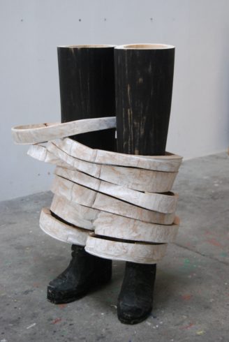 Nicht immer kommt der kunsthistorische Kontext intellektuell verschlüsselt daher. In machen Arbeiten ist er bereits im Titel abzulesen, beispielsweise bei der Skulptur „Das Ende der Mimesis oder die Vernichtung der Figur durch die Künstler des 20. Jahrhunderts“ (2012): Ein Diagonalkreuz aus roten Brettern trägt anstelle einer menschlichen Figur eine blaue Herrenunterhose. Dabei ist das Kreuz in Rot als Statthalter des Gegenstandslosen, Minimalistischen oder Konkreten und als Negation zu verstehen, das die Unterhose als Statthalter des Figürlichen quasi durchstreicht.