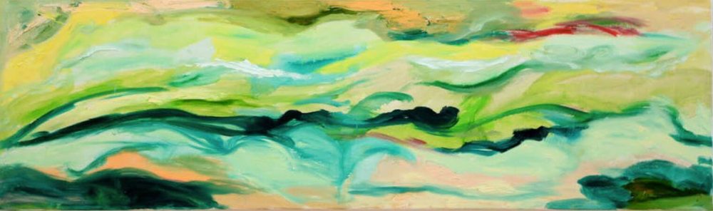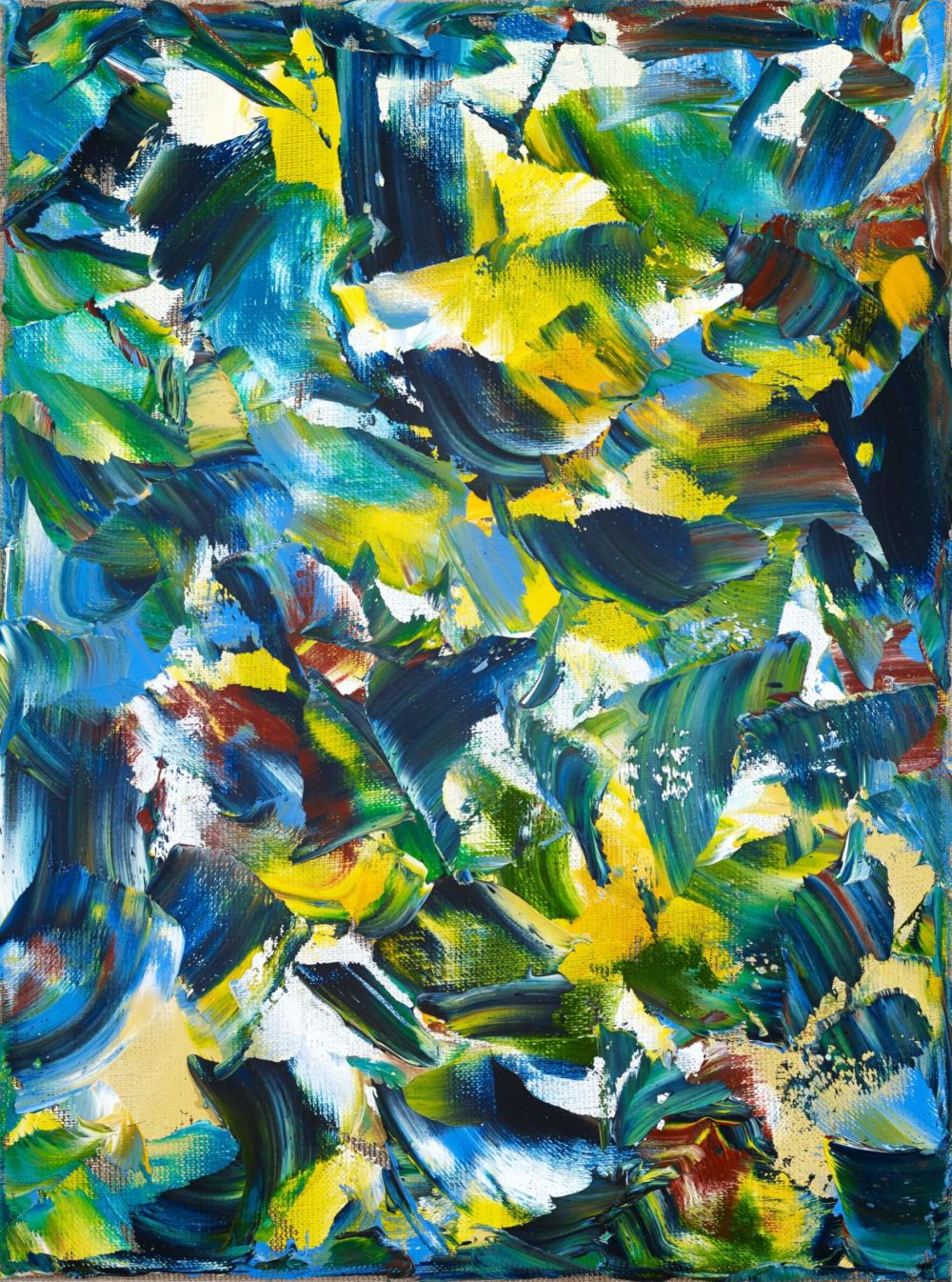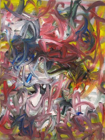 Dass die Künstlerin, wie Zhuangzi empfiehlt, in ihrer Imagination unterschiedliche Perspektiven einnimmt, beweist ebenfalls eine kleinformatige Gemäldesequenz aus der Serie, in der sich die Farben – auf einer Leinwand von 40 x 30 cm Größe – ruhiger und langsamer bewegen. Spätestens hier wird klar, wie sehr sich die Arbeitsweise der Frankfurterin und die sachliche Atmosphäre des Ateliers gegenseitig bedingen: Huang bedarf keiner Anreize, Inspirationsquellen oder Vorlagen beim Malen.