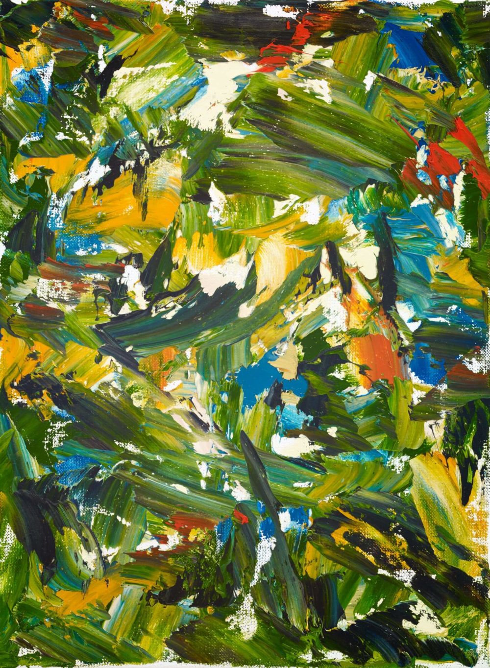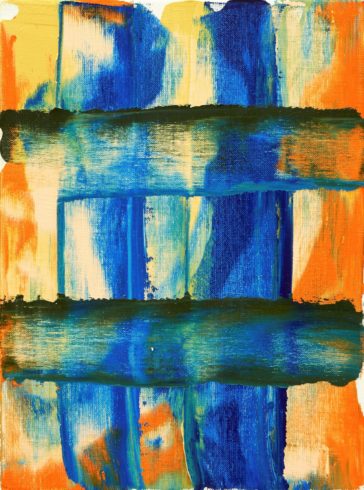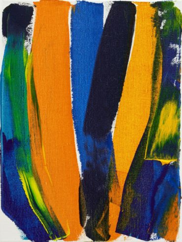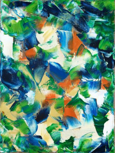 Das ist auch für die Werkreihe Painter’s Portrait relevant, die die Künstlerin im Jahr 2016 zeitlich versetzt zu Wandering beginnt. Sie entschließt sich spontan, auf dem kleinen, schon dort erprobten Maß von 40 x 30 cm Franz Marc zu evozieren. Als eine Art Porträt des eigenen Verständnisses von Marcs Umgang mit Farbe und Form schafft sie ein wunderbar lockeres Gestöber aus Grün-, Blau- und Orangetönen.