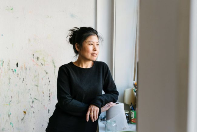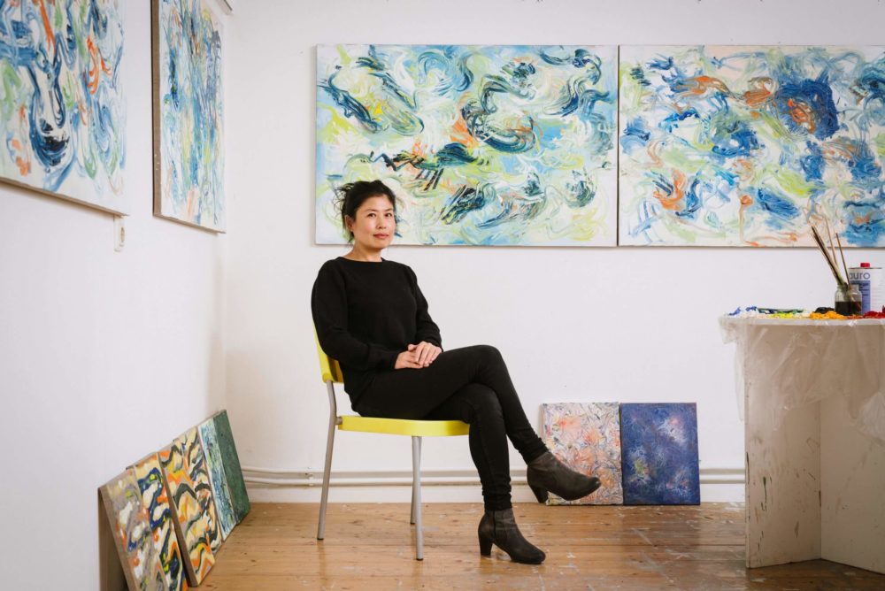 „Etwa acht Jahre lang bewege ich mich in dieser ‚Schwimmphase‘“, lacht Huang und erzählt, dass sie währenddessen, im Jahr 2007, auch ihr heutiges Atelier bezieht. Die Lage könnte nicht besser sein: Das Museum für Moderne Kunst liegt vis-à-vis, die Galerien im Kunstquartier und die Schirn Kunsthalle sind nur einen Steinwurf entfernt. An der Nordseite des nach Osten ausgerichteten Arbeitsraums hängen zwei große Leinwände direkt an der Wand, die eine begonnen, die andere noch leer. Eine Staffelei gibt es nicht, der Gesamteindruck ist schlicht und zweckmäßig.