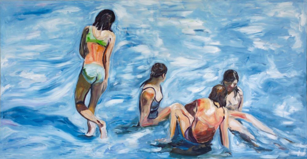 In diesem Bild kommt es zu einer sehr lebendigen Balance zwischen Abstraktion und Figuration. Die Körper der Dargestellten wirken teils stromlinienförmig, unter Wasser verlieren sie ihre Konturen und verflüssigen sich. Alles ist sonnenbeschienen, Mensch und Natur finden hier zu einer von expressiven Pinselschwüngen durchfluteten Synergie.
