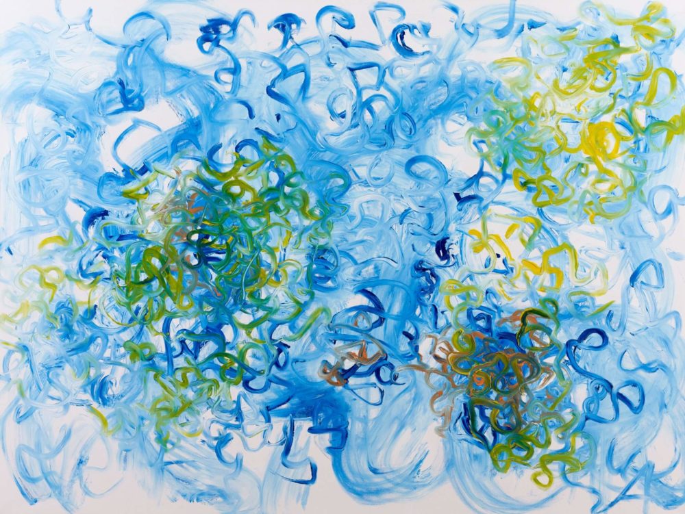 Für Wandering in Absolute Freedom entfernt sich Chunqing Huang geistig aus ihrer räumlichen Realität, taucht gedanklich tief in die Natur ein und bringt diese Eindrücke als dynamische, nun vollkommen abstrakte Kraftfelder auf die Leinwand: Da schwirren zum Beispiel blaue, zum Teil mit anderen Tönen durchsetzte Farbbündel From Ocean to Sky und verdichten oder verknäulen sich an der Bildoberfläche, während sie Von Form zu Form leicht und gelöst vor gelbem Grund tanzen. Huangs Innere Stimmung zeigt sich in temperamentvollem Lineament mit schriftartigen Zügen sowie in Kompositionen aus kürzeren, kurvigen Pinselgesten, die mal ineinanderzugreifen und mal miteinander zu kämpfen scheinen.