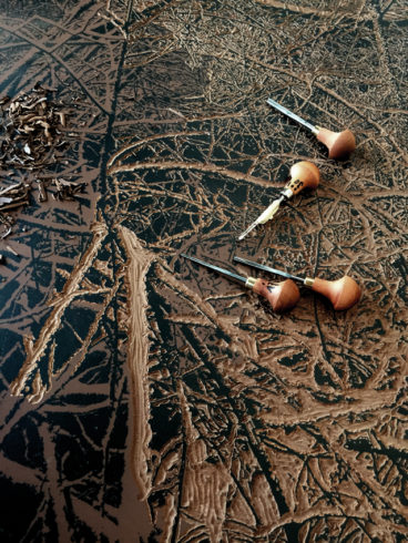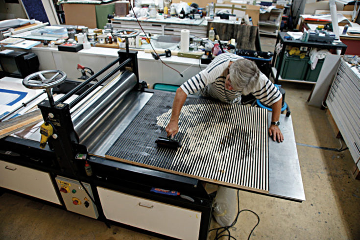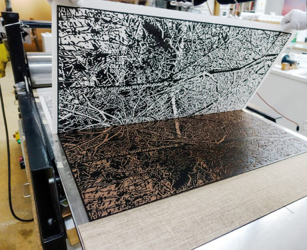 Mit der gleichen Hingabe und Konzentration, mit der er die Druckplatte bearbeitet hat, erstellt Georges Wenger die Abzüge. Für seine schwarz-weißen Drucke färbt er die Druckplatte mit einem Schwarz ein, das er aus Magenta, Gelb und Blau mischt. Darauf legt er ein Blatt japanischen Sekishu-Papiers und reibt die Rückseite Zentimeter für Zentimeter mit dem Baren, einem Abreibteller aus Bambusblatt und Baumwollschnur, ab. Der Vorteil der japanischen Drucktechnik liegt auf der Hand: Auf diese Weise kann er die Intensität der Halbtöne beeinflussen. Das Resultat seiner Anstrengungen bleibt jedoch auch für den erfahrenen Künstler so lange ungewiss, bis er den Abdruck schließlich vor Augen hat.