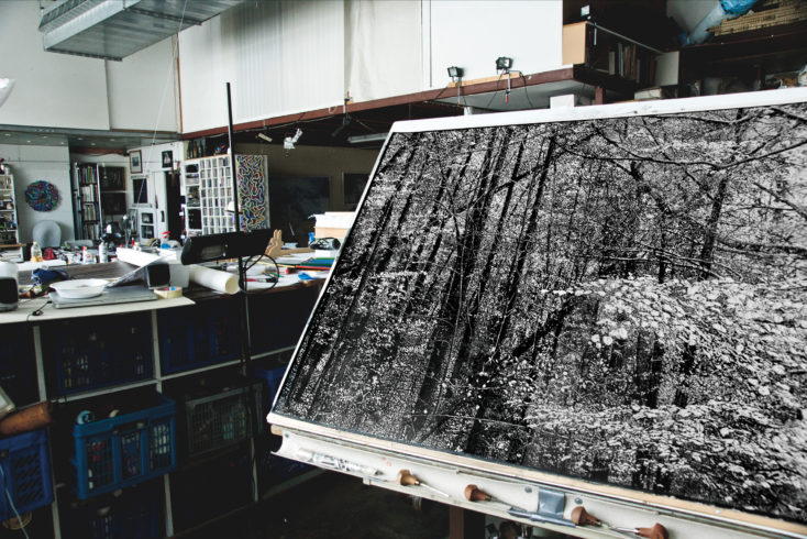 Dass es sich bei den Arbeiten des Schweizer Künstlers um großformatige Linoldrucke handelt, mag man angesichts der bis ins Feinste ausgearbeiteten Details und der nuancenreichen Halbtöne aus rein schwarzen und rein weißen Stellen kaum glauben. Seit etwa zwei Jahren arbeitet Georges Wenger in seinem Atelier in einer ehemaligen Maschinenfabrik in Winterthur an diesen Linolschnitten. Dafür hat er ein von ihm angefertigtes fotografisches Motiv mittels Fotodruckverfahren auf die Linolplatte übertragen. Mit zum Teil eigens dafür entwickelten Werkzeugen und erfahrener Hand sticht und schneidet der Künstler nun präzise die Strukturen heraus und macht selbst kleinste Differenzierungen sichtbar.