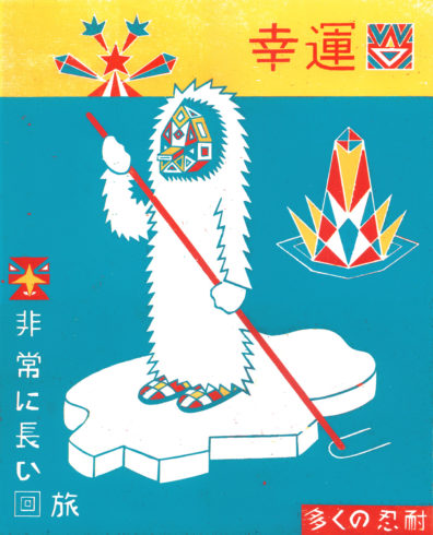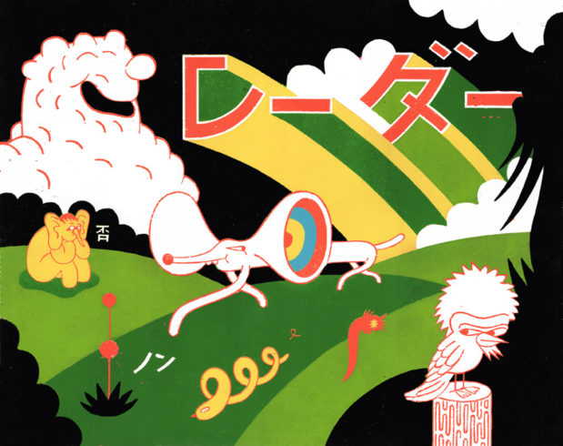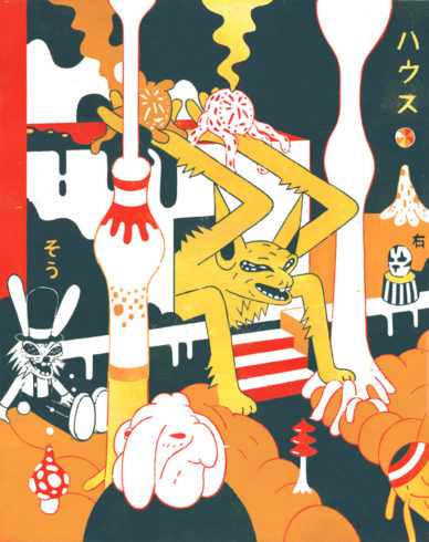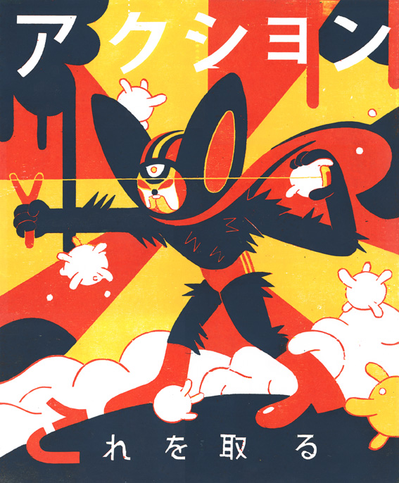 Nicht nur die Technik, auch die Bildwelten selbst appellieren an das Gefühl des Verloren-Seins. Wie in einem angenehmen Rausch erfährt man von wilden Tieren, anthropomorphen Mischwesen und unmöglichen Landschaften. Mit Überschriften, Untertiteln und comichaften Sprechblasen vermengt er die Ratlosigkeit mit der Unwirklichkeit des Gesehenen, denn die abgebildeten Sprachen sind für die meisten Europäer nicht lesbar. Japanisch und Russisch haben es ihm aufgrund von Reisen besonders angetan. Merkwürdigkeitsverstärker nennt er die Schriftzüge aus Kanji und kyrillischem Alphabet. Merkwürdig deswegen, weil sie nach stetiger Aufmerksamkeit verlangen, verstärkend wiederum, da sie die Irritation katalysieren. Ihre Zeichenhaftigkeit unterstreicht die inhärente Energie der Fabelwesen und Superschurken, die das Publikum mit Buntfarbigkeit und scheinbarer Harmlosigkeit anziehen. Steht man jedoch erst einmal vor einem Blatt wie „Naruto“, das von fern her wie ein Filmplakat anmutet, und erfasst die eigentliche Handlung der Kreatur – ein Wesen halb Fledermaus/Viertel Mensch/Viertel Gummistiefel – kann von Sicherheit nicht mehr gesprochen werden. Kloneks narrative Formen-Mutanten besitzen Zähne, sie können riesengroß oder winzig sein, erinnern an Naturgewalten geboren in der Petrischale oder haben, wie eben in „Naruto“, ihre eigenen Waffen mitgebracht. Dass viele mit sich oder ihrem eigenen Unglück beschäftigt zu sein scheinen, ist kein Grund zur Entwarnung und eben das Ergebnis eines Skizzenbuches, dessen verworfene Figuren erst recht neugierig machen.