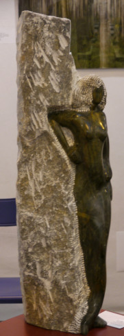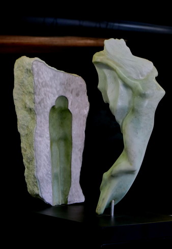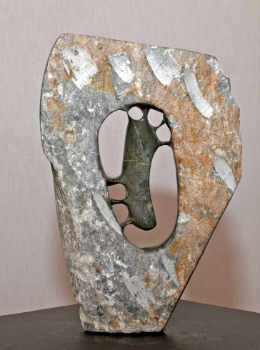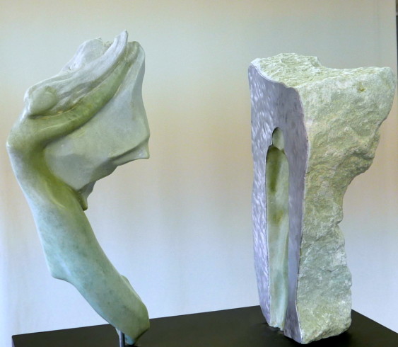 Aber noch ein anderer Gedanke, ja, eine geradezu körperliche Handlung ist für die Kunst von Stefanie Wollenhaupt wichtig: Der Vorgang des Umfangens – zwischen Schützen und Bedrohen – erweist sich als ein Zentralmotiv ihrer Bildhauerei. Eine der ältesten Skulpturen im Atelier ist „Innen-Leben“ (2008), geschlagen aus der Steinsorte Stearit, die eine Vielzahl farblicher Nuancierungen bereithält und zwischen ihrer unbearbeiteten Außenhaut und ihrer inneren Struktur deutlich differiert. Das ist nun auch ein zentraler Aspekt von „Innen-Leben“. In die dreieckig ausgerichtete dünnwandige Scheibe, deren Ecken amorph auslaufen, hat Wollenhaupt ein Oval geschnitten, in dem sich, verbunden an wenigen dünnen „Stäben“, die Form eines Keimlings befindet. Während die Außenform unruhig pulsiert und im oberen Bereich tiefe Einkerbungen wie Verletzungen aufweist, ist der Keimling poliert, glatt und erheblich dunkler. Zugleich besitzt er in seiner langen Streckung die Vitalität eines Insektes. Anorganische Materie ist in ihrem Inneren zu organischer verwandelt, als Sinnbild für Leben. Bildhauerisch ist eindrucksvoll, wie Stefanie Wollenhaupt den Kokon aus dem Stein heraus„geschält“ hat und ihn dort stabil hält. Zugleich schlagen in der scharf konturierten Form Positiv (Materie) und Negativ (Aussparung) um: Das formale Geschehen reflektiert noch das inhaltliche Ereignis. Im Zustand des pflanzlichen Wachstums aber sind Bewegung und Veränderung angelegt.