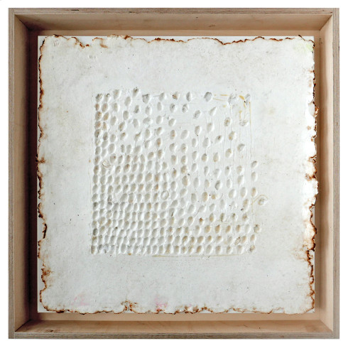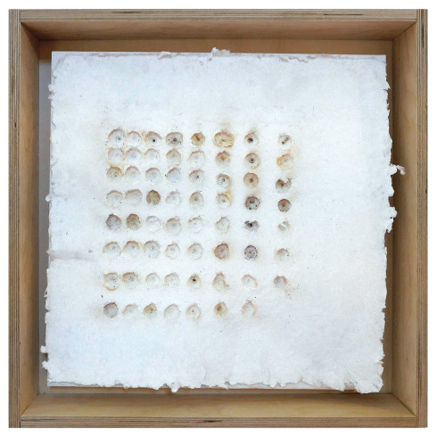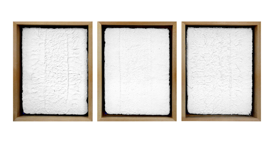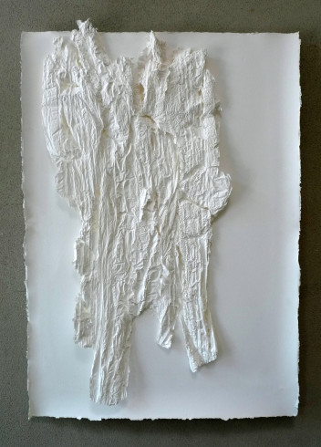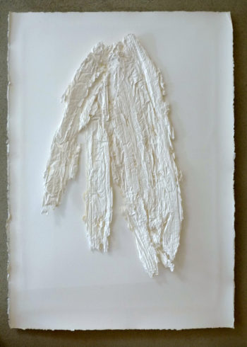 Dann fällt der Blick im Atelier auf die Fundstücke, Wurzeln auf einem der Tische. Sie sind Anregung, können selbst noch zu Skulpturen führen. Stefanie Wollenhaupt nimmt sie in die Hand, reicht sie weiter. Aber sie sind noch, ebenso wie Alltägliches, etwa Textilien und Stoffstücke, Grundlage für die Papierreliefs, die seit ein paar Jahren neben der Bildhauerei entstehen. Auch da spielt die Erfahrung mit den Fingern eine große Rolle: Stefanie Wollenhaupt legt die feuchte Zellulose über Gegenstände und Strukturen, die sie gefunden hat, etwa alltägliche Gerätschaften und Stücke von Stoff, und druckt diese Formen ab. Meist in Weiß, aber mittlerweile auch in anderen Farben, entstehen daraus etwa Raster, die als lebhaft rhythmische Struktur zwischen Ordnung und feiner Abweichung den Blick in tiefere Schichten ermöglichen („Structure 3“, 2015). Die dreiteilige Gruppe der „Whymos“ (2013) wieder wird kaum sichtbar, aber umso inniger, auf ihrer Oberfläche nuanciert. Wir sehen eine langgezogene, vertikale breite Bahn, welche mittig von Rand zu Rand führt und an ihren Kanten die Materie aufwirft wie Reifenspuren im Schnee – aber das wäre nur eine von vielen Deutungen, und Stefanie Wollenhaupt möchte eigentlich alles offenhalten und möglichst wenig an Interpretation vorgeben. Und sie hat ihre Papierreliefs auch in den Raum erweitert, etwa indem sie ein Hemd abgeformt und in seiner Bewegtheit fixiert hat („Gewandet 1“, 2014). Damit teilt sie leibliche Erfahrung mit, die noch als Stellvertreter für den Menschen fungiert.
