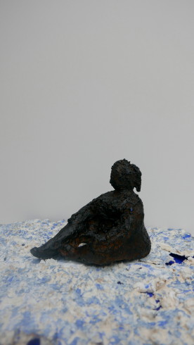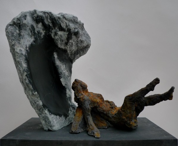 Die heitere Besonnenheit und stille Nachdenklichkeit ist hier der Normalzustand. Draußen, im Hof, schlägt Stefanie Wollenhaupt die Form aus dem Stein, oben im Atelier erfolgt die Feinjustierung, das Nachschleifen und das Polieren. Hier arbeitet sie auch mit Ton, formt aus der feuchten Masse ihre Figuren: Ja, es sind immer Figuren, meist Frauen, die sie mitunter in einen Rostton fasst. Der Körper ist als Volumen verstanden, daraus entwickeln sich anekdotische Szenen, etwa wenn eine realistisch modellierte füllige Frau auf einer sich kräuselnden weißen Ebene aus Papier, die mit hellem Blau unterlegt ist, sitzt, eine Touristin am Strand: Die Plastik heißt – genau so geschrieben – „Inruhe“ (2015). Sie habe das Leben zeigen wollen, wie es ist, sagt Stefanie Wollenhaupt, und gerade dem Frauentypus der Modemagazine widersprechen wollen. Alles andere als die Gelassenheit des Urlaubs kennzeichnet hingegen eine Skulptur, die 2013 aus der Kombination von Stein und Ton entstanden ist. Bei „Die Welle“ erweist sich das Meer als Bedrohung: Über einer weiblichen Figur wölbt sich eine Wand und schließt sich dabei fast zur Röhre. Sie scheint im nächsten Moment über der Frau mit den lockigen langen Haaren zu zerspringen und sie zu umhüllen. Diese lehnt sich nach hinten, ihre Beine rudern in der Luft, sie hält gerade noch die Balance. Und über ihrem Körper breitet sich der grauweiße Stein aus. Seine Öffnung lässt an einen Schlund denken … Natürlich spielt Stefanie Wollenhaupt auf den Tsunami und all die Naturkatastrophen an, die oft mit dem Klimawandel einhergehen. Und es lohnt sich darüber nachzudenken, dass das flüssige Wasser hier als starres, festes Gestein dargestellt ist.