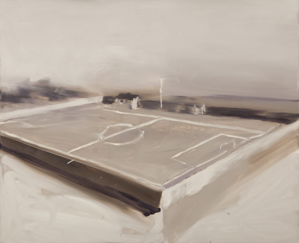 Uta Schotten greift wiederholt auf die überschauende räumliche Perspektive zurück. Hier schaut der Betrachter wie ein außenstehender Beobachter auf die Geschehnisse, die in ihrer Distanziertheit und Kleinheit wie ein Modell einen surrealen Klang tragen können. Etwa ein Fußballplatz aus einer malerisch expressiven Oberfläche, der sich, mit kantigen Bahnen umrissen, in die Tiefe einer kargen Landschaft ausstreckt und dadurch wie auf einen Tisch versetzt wirkt. Im minutiös abschreitenden Überblick zeichnet sich eine Position des Beherrschens ab, die vielleicht sogar auf Besitz- und Dominanzstrukturen weisen könnte, auf das Funktionieren der Gesellschaft und, erneut, den Umgang dabei mit der Erde.