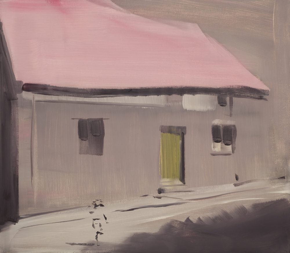 Einige Tage später, beim Atelierbesuch im Atelier im Kölner Agnesviertel, Souterrain, zur Straße hin. Der Raum niedrig, eher ein Schlauch – nichts, was vom Bild und seiner Betrachtung ablenkt. Im Anschauen der Bilder mit etwas Abstand und dann aus nächster Nähe, mit dem Abtasten mit den Augen, wird deutlich, wie sehr die Gemälde von Uta Schotten kleine Sensationen des Sehens und der Empfindung sind. Sie wirken weich und nachgiebig. In der Reduktion der Farbtöne bis hin zur Monochromie vor einem helltonigen Grund und den minimalen, im Farbverlust gesteigerten Nuancen erinnern sie an leicht verblichene alte Fotografien, aus denen die Buntfarben herausgezogen wurden. Das Dokumentarische von Zeitungsfotos, die aus ihrem Zusammenhang genommen sind und umso mehr für sich sprechen, klingt an. Zugleich liegt eine Bewegungsunschärfe vor. Umrisse verwischen, Fensteröffnungen lösen sich im Summarischen des Pinselstrichs auf, als läge Nebel oder eine beginnende Dämmerung über allem. Aus der Bildtiefe scheint wie im Gegenlicht Helligkeit auf, dabei wirkt der Bildraum dreidimensional.