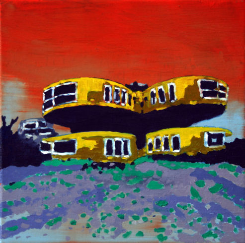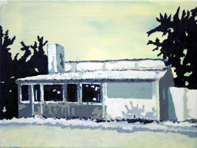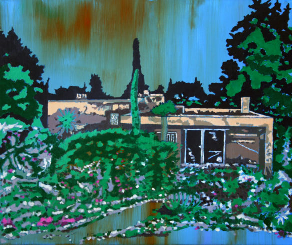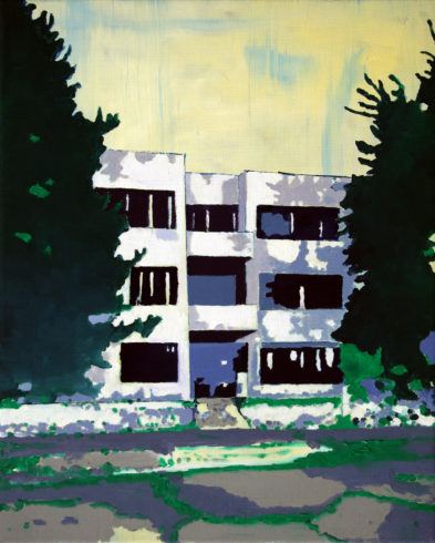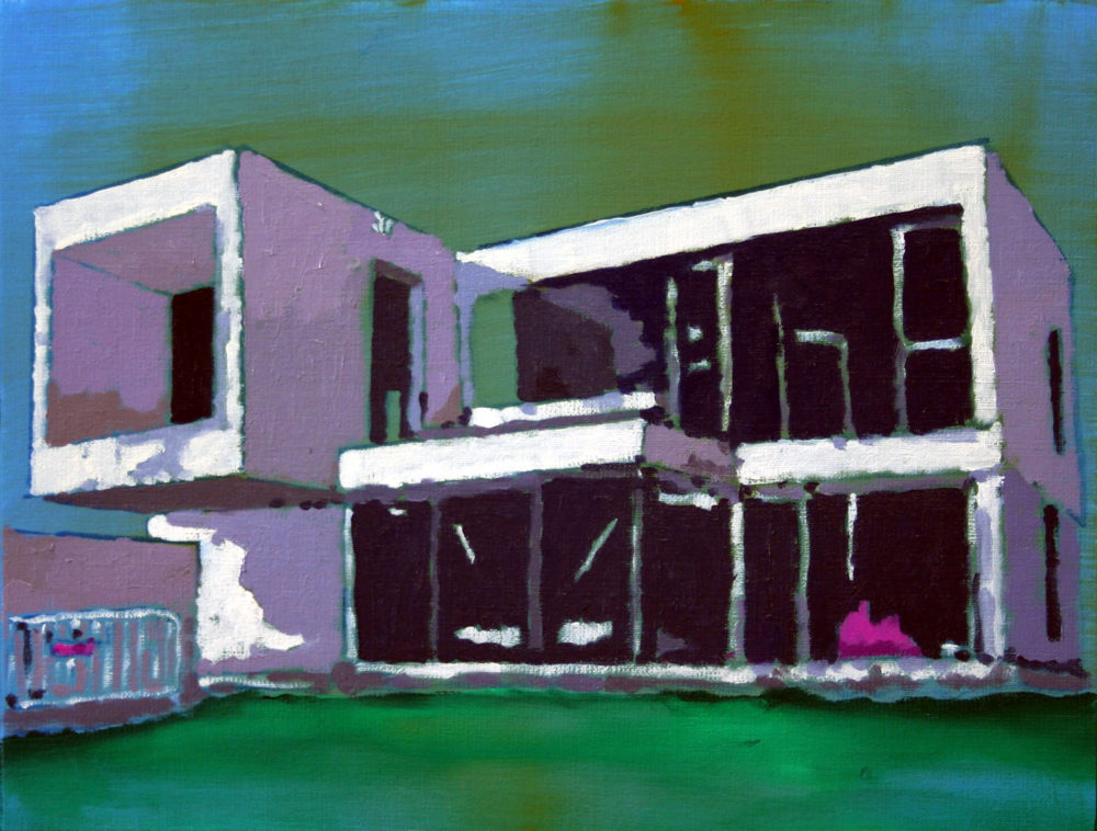 Die verlassenen Gebäude seiner Bilder, nicht annähernd so alt wie jene, deren Ruinen ihn vor Jahren in Sizilien beeindruckten, sind nach unserem Geschmacksempfinden hässlich. Plattenbauten wie Bungalow, (Kauf)-Halle oder Wohnblock aus dem 20. Jahrhundert sind auf klare geometrische Formen angelegt wie etwa seine kleine, jüngst geschaffene Malerei „Bauhaus“. Dieser wohl gewählte Titel muss als Hinweis auf Segen und Fluch der Bauhaus-Bewegung vor einhundert Jahren verstanden werden: rechte Winkel, glatte Flächen, steril anmutendes industrielles Baumaterial. Diese Art von Reinheit und Strenge findet eben darin ihre ästhetische Qualität. Natürliche Veränderungen, die mit der Zeit unweigerlich eintreten, sind unkontrolliert und organisch und konterkarieren damit die Geometrie mathematischer Formen. Im Bewusstsein dieser Verwandlungen setzt der Maler seine Farben. Weich und natürlicher Bewegung, eigener Gesetzlichkeit folgend, schafft er eigene, dem Realen entlehnte Bilder. Das malerisch Geschlossene täuscht aber nicht über den Kampf der Gegensätzlichkeiten hinweg.