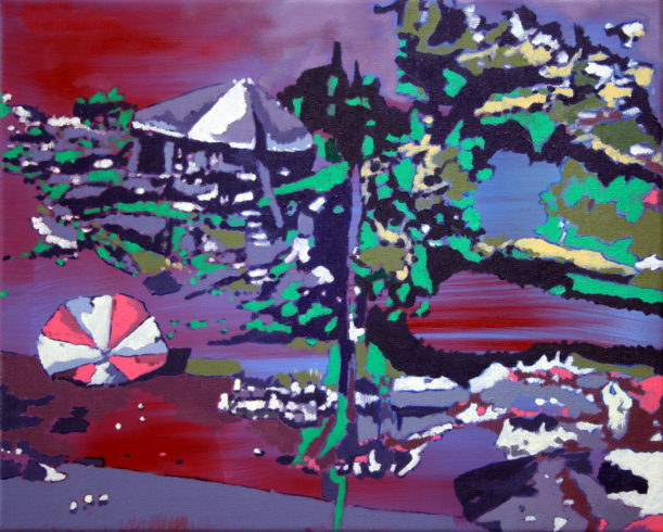 Müllers Malerei hat aber noch andere Aspekte, von denen hier unbedingt dieser eine genannt werden muss: Kein Mensch wird Maler, wenn er nicht die Farbe liebt. Sizilien mit der Leuchtkraft der Farben muss so etwas wie ein Erweckungserlebnis gewesen sein. Eine Leidenschaft ist augenscheinlich, wenn man auf sein Œuvre schaut. Die Überhöhung der Farbe ist sicher auch Lust am unendlichen Experiment, sinnliche Freude an der Wirkkraft, den Möglichkeiten der Kontraste, der Farbnachbarschaften, der Erzeugung von Stimmungen. Und da ist es interessant, dass er in die gegenständliche Malerei gewechselt ist, nachdem er bei Frank Badur an der Universität der Künste mit der abstrakten Malerei begonnen hatte. Er fand heraus, dass er nach Bildern suchte, danach, wie er eine dem Realen entlehnte Form auf die Leinwand bringen könnte. In seinem Werk vereint er nun beides: Farbe und Gegenstand. Und um die Farbe darin weiterhin erforschen zu können, schuf er zum Beispiel seine weißen Bilder, in denen er nun ein sehr schmales Spektrum in feinen Nuancen auslotet. Sein „Sommerhaus“ aus dem Jahr 2016 ist der oben beschriebenen Idee geschuldet, ein erkennbarer Müller im Duktus und in der Gegenläufigkeit seiner „Protagonisten“. Das Sommerhaus im Schnee lässt doppelt frieren, denn nicht allein die winterlichen Farben, auch die doppelte Verlassenheit – die Bewohner scheinen das Häuschen nicht nur im Winter, sondern ganz und gar verlassen zu haben.