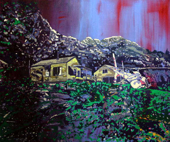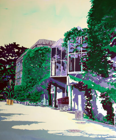 Noch sind die künstlichen „Gebilde“ in ihrer Versehrtheit sehr gut erkennbar. „Botschaft“ nennt Müller ein anderes seiner unverkennbaren Werke. Der Titel suggeriert ein Verwaltungsgebäude, das Bild ein nicht mehr genutztes Bauwerk im, nun ja, modernen Stil in offenbar vollkommener Verwahrlosung. Deprimierend. Eigentlich. Die ehemals weiße Außenwand ist fleckig, Fenster sind zerschlagen, Gegenstände der Innenausstattung achtlos nach draußen geworfen, ein alter Teppich vorn rechts hängt über einem rostigen Geländer, einem übrig gebliebenen Stück Zaun oder einem Mauerstück? Man ahnt den Schmutz, muffigen Geruch. Aber dann das frische Grün, wie es sich ausbreitet als bekäme es neue Nahrung, neuen Raum; das Lebendige nimmt Besitz vom Leblosen. Müllers Material, Ölfarbe und Leinwand, ist in seiner Stofflichkeit nicht reproduzierbar, und so kann man mit der Abbildung auf dem Papier oder dem Bildschirm nur ahnen, wie treffend er in diesem Bild emotionale Ambivalenzen, Tristesse und Heiterkeit erfahrbar macht. Aber da ist noch etwas anderes. Ein ungutes Gefühl. Der Maler arbeitet mit einer Überhöhung der Farben. Leuchtendes Blau, grelles Pink, Giftgrün erzeugen eine künstliche, surreale und feindlich anmutende Stimmung. Die ehemals vorgefundene reale Situation bekommt im Bild eine weitere Dimension: Eine Entrückung in den Bereich der Bühne.