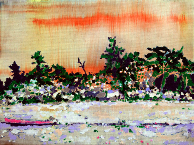 Ein anderes „Stück“ nennt er „Paradise lost“. Das Apokalyptische dieser Szenerie, als sei sie einer fremd-unnatürlichen, gleißenden Beleuchtung ausgesetzt, erinnert auch hier an eine Theaterbühne, auf der Geschichten dargestellt werden. Wir werden zum Zuschauer. Es ist ebenfalls eine Erzählung vom Wechsel. Eine fröhlich getupfte Flussfahrt verliert ihre Heiterkeit sofort angesichts der gebeugten Baumriesen am Ufer vor der Himmelsglut rätselhafter feuerroter Schweife. Wir ahnen, das schrille Licht, gefährlich anmutende Nebel bedeuten eine Katastrophe am einst idealen Ort. Es ist ein besonderes Bild im Œuvre des Malers, denn hier wird die Natur in ihrer Ohnmacht erinnert. Anders als in Müllers menschleeren Landschaften, in denen sie erstarkt und sich zurückholt, was ihr einst entrissen wurde, ist sie nun über ihre Maße hinaus geschwächt.