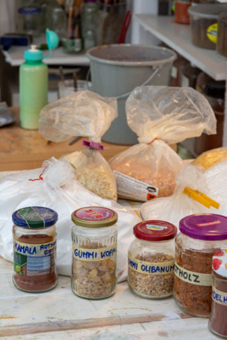 Seither stellt Wolfgang Blanke seine Farben selber her. Egal, ob er Pigmente mit Ei, Gummen, Harz, Leim, Öl oder Wachs aufbereitet oder sie mit wässrigen Bindemitteln zu Emulsionen mixt, „das Arbeiten mit Pigmenten und Bindemitteln erlaubt es mir, auf eine große Anzahl von Techniken zuzugreifen, die sich alle verschieden anfühlen“, erklärt er.