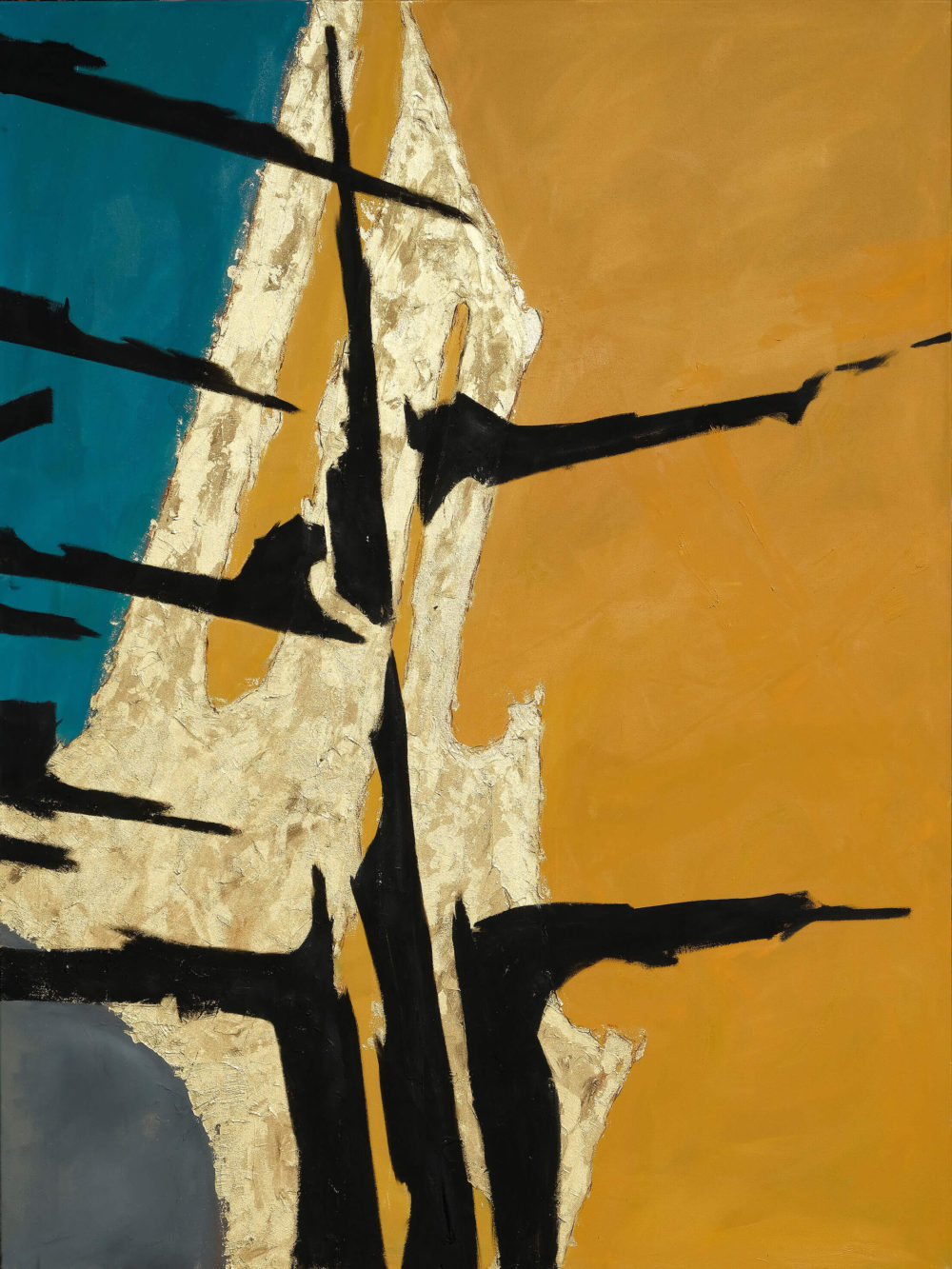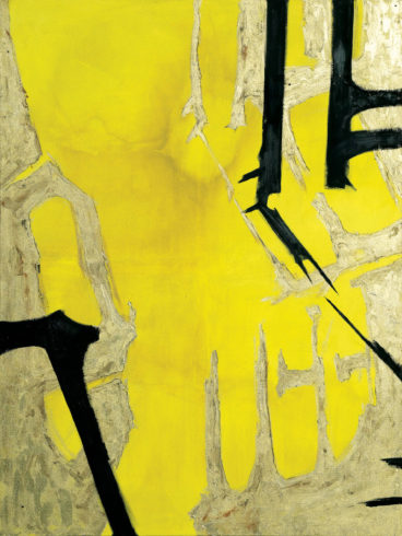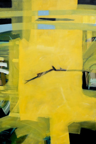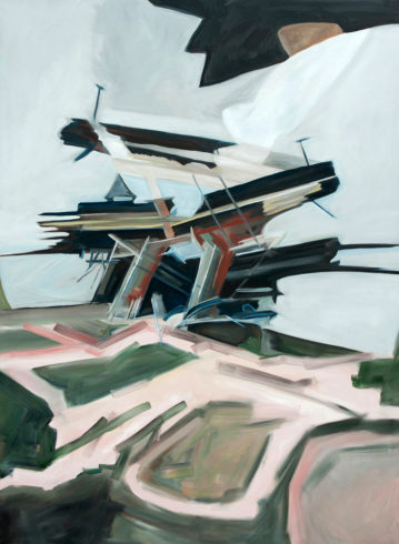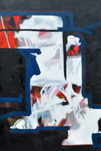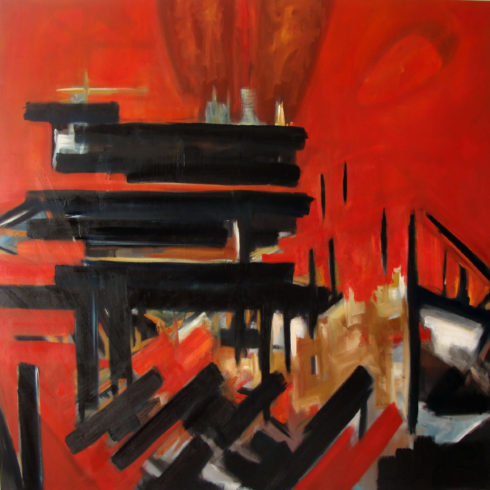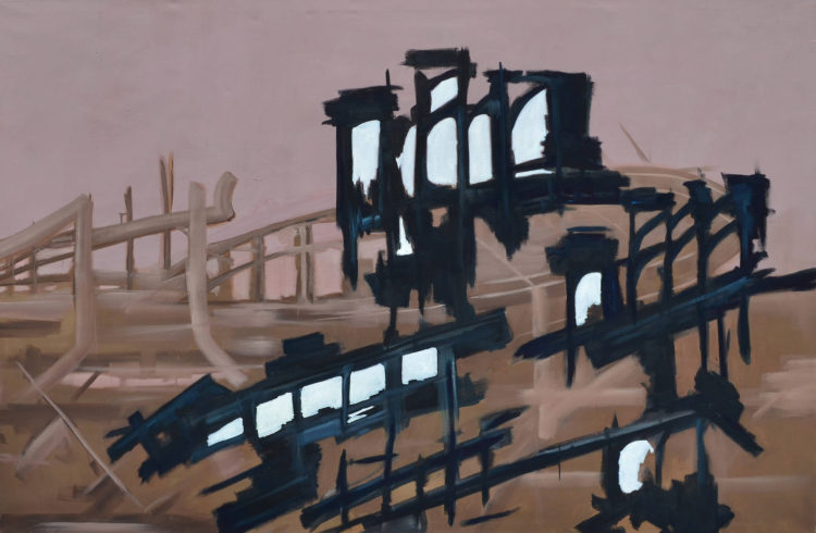 Linien durchdringen sich, überlagern sich, führen zu den Bildrändern, wo sie wie abgeschnitten enden. Noch ist die Bildmitte gut gefüllt. Man erkennt Pinselspuren in linearen Elementen, erahnt Verstrebungen zwischen eckigen, gerundeten oder rein linearen Formen. Die Assoziation moderner Bauwerke drängt sich auf. Doch eine Antwort darauf, ob es tatsächlich Bauelemente aus Stahl und Beton sind, gibt die bloße Betrachtung des jeweiligen Gemäldes nicht.