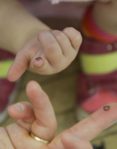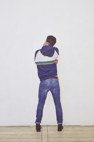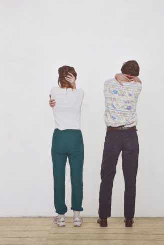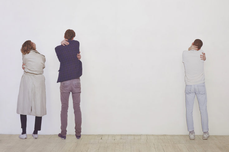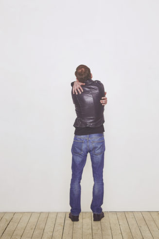 Vor die Wände der Galerie montiert waren auch lebensgroße Pappaufsteller von Menschen in Rückenansicht, die sich selbst umarmen, dabei allerdings beim Betrachter die Illusion erzeugen, er sehe ein Liebespaar. Diese Serie mit dem Titel „+1“ entstand 2015. Sie geht auf Verfolgungsjagden in Filmen zurück, bei denen der Flüchtende schließlich, in die Enge getrieben, in dieser erotisch wirkenden Pose verharrt. Das performative Element trifft hier auf die Vereinzelung des Individuums in der Gesellschaft und tänzerische Ausdrucksformen.