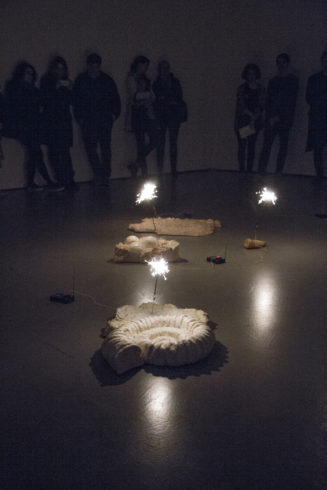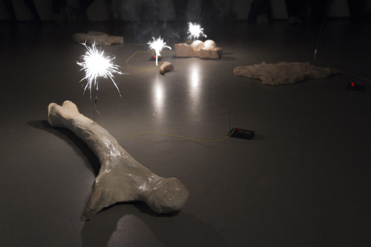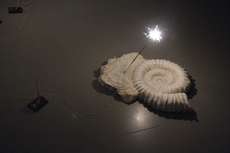 Das kann das Hantieren mit Feuerwerk und Wunderkerzen sein wie bei einer Performance im Hamburger Kunstverein während der Langen Nacht der Museen, als Frohne-Brinkmann für die Arbeit „Fossil Feast“ (2016) Gipskörper in Form von Fossilien mit Wunderkerzen gespickt hatte und diese dann per Funk zündete.