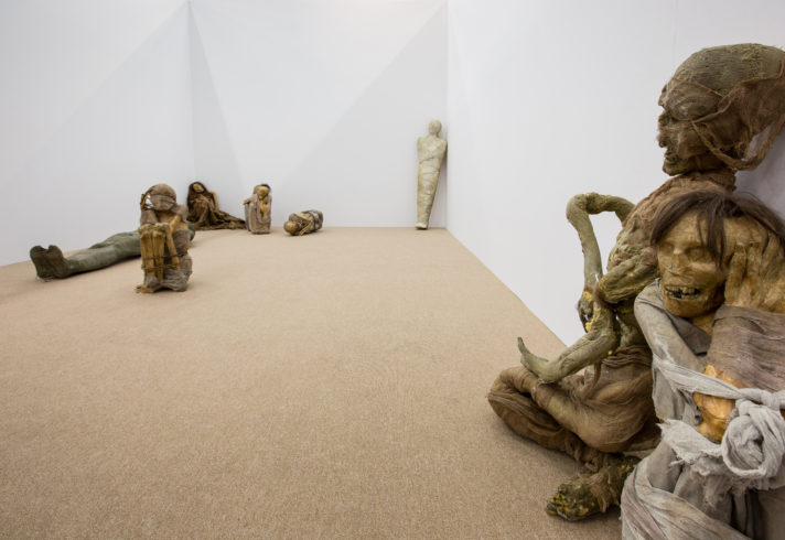 Oder aber der Umgang mit Nachbildungen von Mumien. Für die Bespielung seiner Förderkoje auf der Art Cologne im April 2016 lieh sich Gerrit Frohne-Brinkmann aus dem Fundus von Theater- und Filmrequisiteuren eine Reihe von mehr oder minder gelungenen Mumienattrappen aus und präsentierte diese, einer Aufführung gleich, sitzend, liegend und kauernd in der ansonsten leeren, 25 Quadratmeter großen Messekoje. Eine temporäre Zusammenkunft an der Schnittstelle von Archäologie, Wunderkammer, Horrorfilm und Trashkultur. Die aus dem Dunkel der Geschichte stammenden Mumien wurden so einerseits zu Kunstwerken erhoben, andererseits aber auch in ihrer prekären, nahezu Mitleid erregenden Präsenz vorgeführt. Ein weiteres Moment kam hinzu: Nach Ablauf der Messe wanderten die Objekte wieder in den Fundus zurück. Ein möglicher Käufer der Arbeit mit dem Titel „Not all mummies are wrapped like in the movies“, erwirbt er daher nicht die Mumien selbst, sondern lediglich das Recht, genau diese oder auch andere Mumien wiederum auszuleihen und an einem neuen Ort zur Aufführung zu bringen. Gerrit Frohne-Brinkmann hat es gewagt, in eine Messesektion, die unter dem programmatischen Titel „New Positions“ mit dem (eigentlich unerfüllbaren) Anspruch antritt, das „Neueste vom Neuen“ zu präsentieren, sozusagen das „Abgewetzteste vom Abgewetzten“ einzuschleusen. Die unter anderem mit Yilmaz Dziewior, dem Direktor des Kölner Museum Ludwig, und Moritz Wesseler, dem Direktor des Kölnischen Kunstvereins, hochkarätig besetzte Jury hat dieses Konzept, das auch die herkömmlichen Mechanismen des Kunstmarkts clever in Frage stellt, überzeugt. Gerrit Frohne-Brinkmann setzte sich gegen 20 weitere Bewerber durch. Er und seine Galerie Jürgen Becker aus Hamburg erhielten den New-Positions-Preis 2016 für die beste Förderkoje.