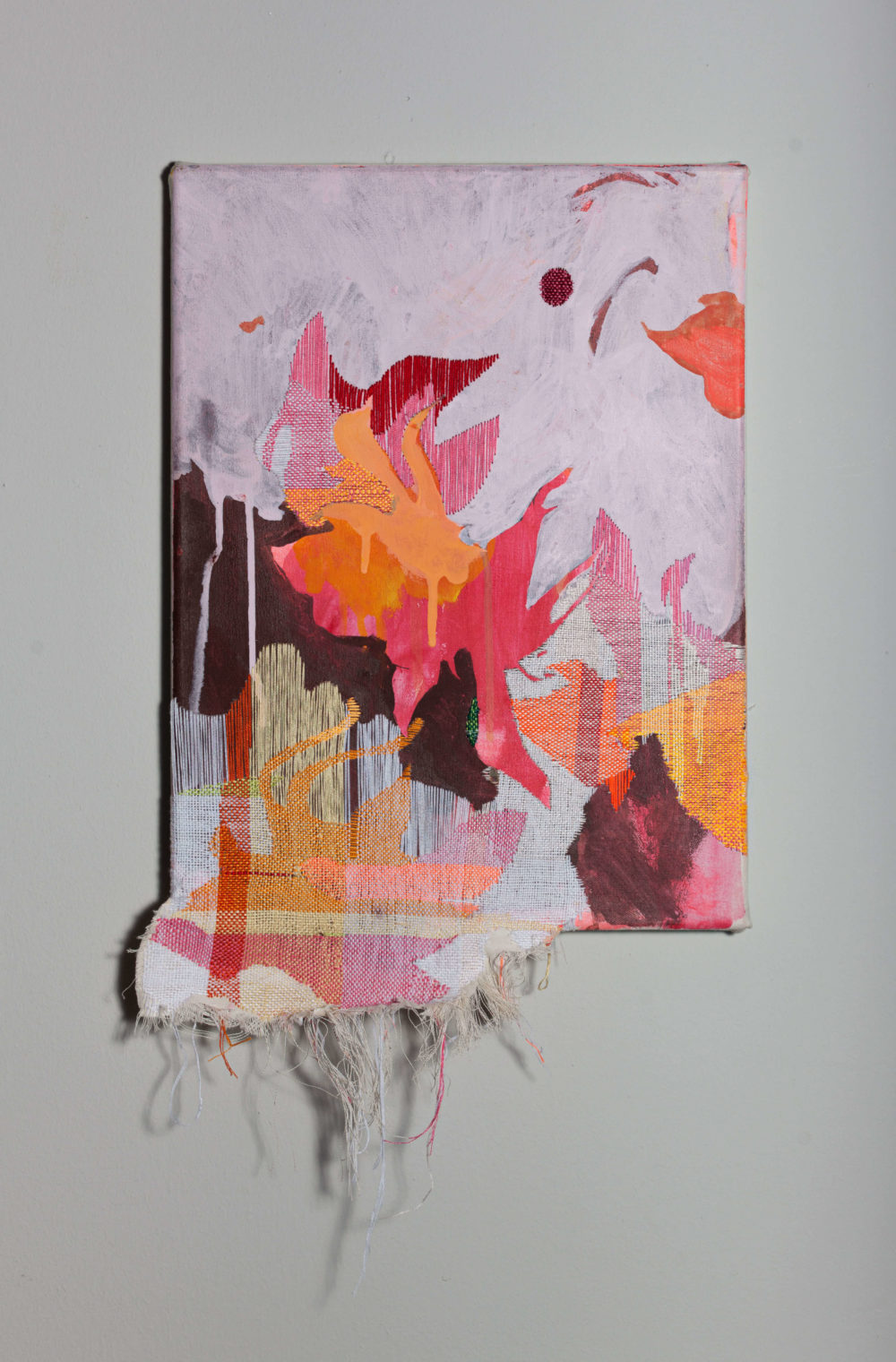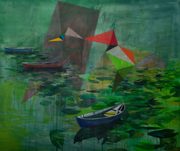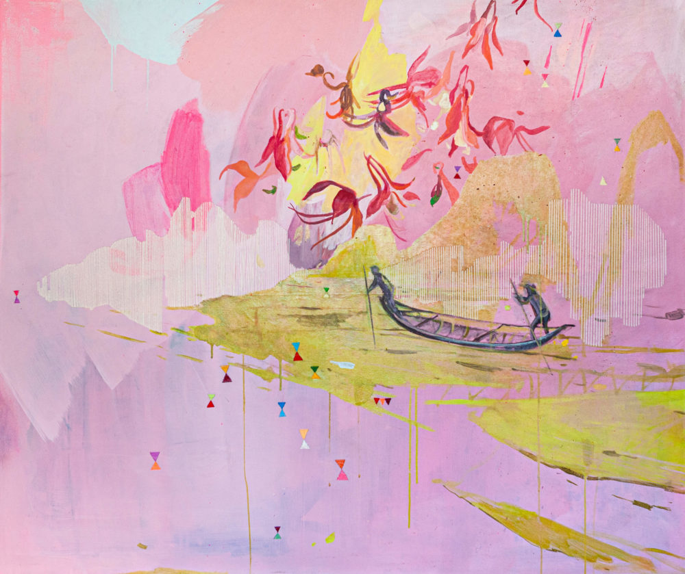 In dem Gemälde Handling Landing von 2020 steuert ein altes, mit zwei Kahnstechern besetztes Boot durch eine unwirkliche Seenlandschaft. Im Hintergrund bauschen sich rasant ausgeführte, variiert rosafarbene Pinselschwünge zu Abstraktionen von Wolken oder Hügeln auf, während riesige Blüten in Rot-Orange durch die Luft flattern. Die ganze Szenerie ist in pinkfarbenes Licht getaucht, das sich in der Wasseroberfläche spiegelt und dort etwas von einem dunkleren, bläulichen Untergrund preisgibt. Die beiden Figuren in dem detailliert bezeichneten Kahn gleiten ihrerseits durch einen gelb-grünlichen Abschnitt. Das Wasser wirkt hier dickflüssiger, ist aber angesichts des Blütenwirbels immer noch erstaunlich glatt. Auch die opak-wabernden Nebel aus weißem Garn, die sich in Fahrtrichtung auftun und das Boot umgeben, liegen naturgemäß ruhig in der Landschaft. Hinzu kommen kleine, gestickte Kegel, die – sich an den Spitzen berührend – wie winzige Sanduhren aussehen und als bunte Lichtpunkte übers Wasser tanzen. Nichts ist gewiss in diesem Bild, schon gar nicht die im Titel angedeutete Landung des Bootes.