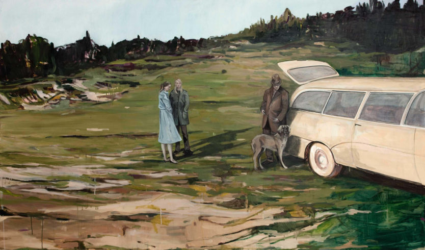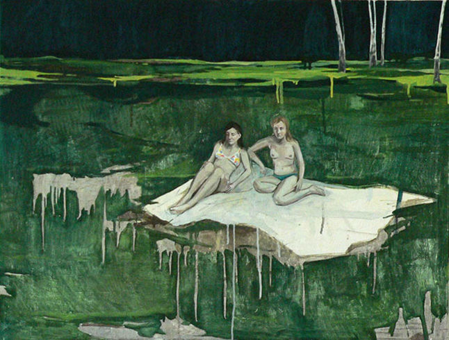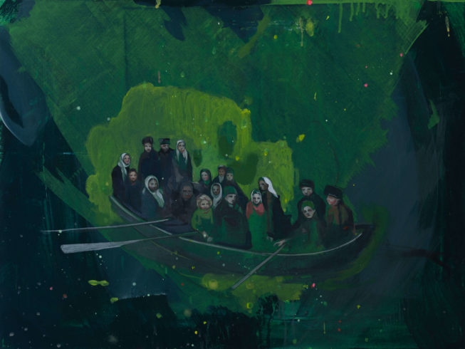 Durchgängig wird im Gespräch die Lust an der puren Malerei, die Auseinandersetzung mit der Stofflichkeit und Wirkung von Farbe spürbar – wie in den Arbeiten, die Lohmann 2019 nach einem Artist-in-Residence-Aufenthalt im finnischen Kokkola schuf. Dort faszinierten sie die dämmrige Helligkeit in der Nacht, die sich magisch schimmernd in dem Bild Zauberland (2019) ausbreitet, sowie die Menschen, deren traditionell gewandete Vorfahren auf einem eng besetzten Boot in History (2021) durch grün-gelbliche, wenig vertrauenserweckende Acrylschwaden mäandern.