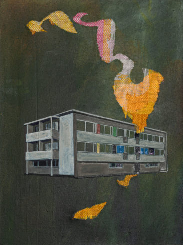 Denn für sie symbolisiert die Stickerei immer einen gewissen Moment der Verletzung, die durch die Perforierung des meist aus Baumwolle bestehenden Bildträgers unabänderlich wird. Sie schreibt damit für sie wichtige Dinge fest, kann nichts mehr ändern, übermalen. Auch das Verweben von Fäden als Rekurs auf die Technik des Kunststopfens ist von inhaltlicher Bedeutung. Im übertragenen Sinn füllt sie damit Löcher des Vergessens, Lücken, die jeder Mensch im Rückblick auf die eigene Kindheit aufweist. Sie offeriert Erzählfäden, die die Betrachter*innen weiterspinnen, mit persönlichen Erlebnissen verknüpfen können. Mit Erinnerungen, die womöglich so verschlungen sind wie die Wege zu Meike Lohmanns Atelier in den Stuttgarter Wagenhallen.
