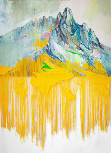 Das ist ebenfalls in dem aktuellen Gemälde Auf die Berge will ich steigen (2020) erkennbar, in dem sich die Darstellung in Form von langen, leuchtend gelben Fäden weit über die Grenzen des Bildes erstreckt. Darin stickt und webt die Künstlerin die Bewegung, das Nach-unten-Rutschen sonnenblumenheller Farbfelder weiter, die sich wie Gletscher in das Meer aus herabhängendem Garn ergießen.