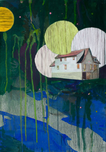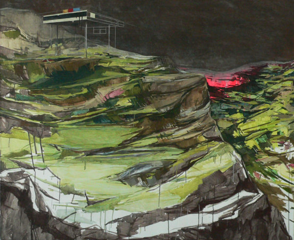 Ein besonders starkes Eigenleben entwickelt die unheimlich anmutende Farblandschaft des Forellenhofs von 2019: Großflächig rinnen fluoreszierende Spuren durch die Dunkelheit, fließen von einem düsteren Himmel in einen blauen See und bleiben ohne inhaltliche Funktion als abstraktes, auch vom Zufall bestimmtes künstlerisches Mittel erkennbar – anders als die grünen Schlieren im rechten Bildvordergrund, die sich teils wie Reflexionen ausmachen. Ein hell beleuchtetes Haus sowie einige mit Nadel und Faden fixierte Lichtpunkte treiben wie eine Erscheinung davor.