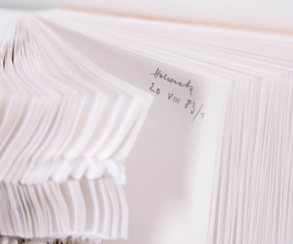 Mit seinen Buchobjekten greift Oskar Holweck seit den 1970er-Jahren in die dritte Dimension aus. Zwischen 1972 und 1987 entstehen diese Objekte, die vor Energie zu bersten scheinen. Teils rückt der Künstler den Büchern mit Brachialgewalt zu Leibe, zerfetzt und zerfleddert sie, verformt Seiten oder schlitzt sie auf. Eine Metamorphose der mitreißenden Art. Freilich gilt diese aggressive Behandlung nie dem Buch als Informationsträger. Eigens für seine Zwecke ließ Holweck unbedruckte Bücher anfertigen. Meist im Format DIN A6 oder DIN A4 und aus handelsüblichem Schreibmaschinenpapier.