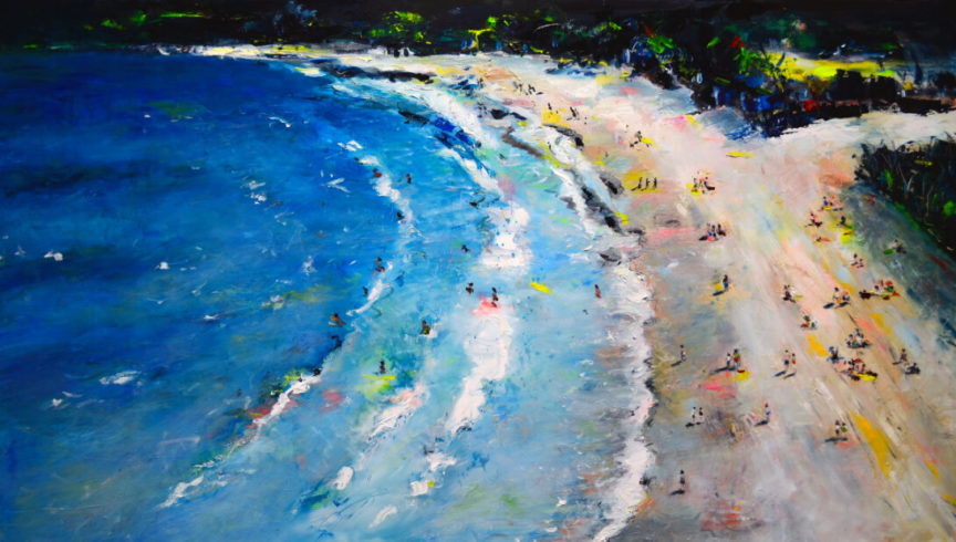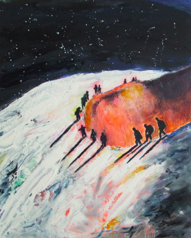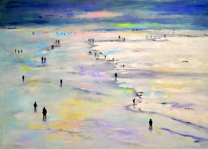 Tanja Vetters Bilder wurden 2017/2018 in der Volkshochschule Heidelberg ausgestellt. Durchgängig sind diese Malereien von oben – teils sogar aus steiler Vogelperspektive – mit einem Abstand gegeben, der es erlaubt, die Gegend zu überblicken und so noch ihre Topographie klärt. Daraus ergeben sich Bildreihen wie etwa Auf Abwegen (2015–2017) mit einem schneebedeckten Berg mit Wanderern schon auf der Kuppe, erfasst in der Dämmerung. Das Licht ist essenziell für den Weißton, der von Bild zu Bild wechselt. Völlig anders ist die Stimmung bei Lazy Days (2017). Hier streift der Blick über einen Strand, der sich, umfangen von einem satten Grün, in perspektivischer Verkürzung nach links krümmt und dabei rasant in die Ferne entrückt. Die Menschen sind winzig und zierlich und eigentlich erst durch ihre Schatten definiert. So wie der Strand über Nuancen des Fahlen verfügt, so ist das Wasser, unterstützt von der weißen Gischt, in seinen Blautönen abgestuft. Dazu wirken der Grund unter der Wasserfläche und das Licht auf der Wasseroberfläche mit. Tanja Vetter schildert auch hier eine eigentlich lapidare, vertraute Situation im genauen Hinsehen. Sie objektiviert in der sachlichen Wahrnehmung und thematisiert noch vorbehaltloses, überschauendes Sehen. Und doch bringt dies besondere Beobachtungen mit sich, etwa den visuellen Sog der Schaum-Schneisen und die fluchtende Präsenz der Strandläufer in ihren Bikinis und Badehosen, die ja schon für sich hinreißende Miniaturen sind. Allmählich stellt man fest, wie farbig das Bild ist und dass sich inmitten der teils verschatteten Grünpartien knallrote Flecken befinden und dass an einer Stelle des oberen Randes die Sonne so stark auf das Grün flutet, dass es als dreieckige Form hell zurückstrahlt. Im deutlichen Querformat als Ausschnitt angelegt, der geradezu unter den Füßen einsetzt (und dem Betrachter das schwindelnde Gefühl eines Riesen vermittelt), wird in diesem Bild unser Sehen in seiner Beschränktheit und seiner Übersicht untersucht und zum Thema der Malerei. Das zentrale Sujet aber ist die elementare Natur mit ihren Erscheinungsformen, die viel differenzierter sind als die künstlich gesetzten Farben unserer Zivilisation. Tanja Vetter antwortet darauf mit dem Vermögen einer Malerei, die zugleich das eigene Potential befragt. Ein weiteres Beispiel dafür ist das Bild Endlos (2016), das in der kippenden Perspektive und der Starrheit der Figuren auf den Farbschollen wie ein abstrakt tachistisches Bild wirkt. Doch auch hier, in dieser szenischen Beiläufigkeit: Es geht um die Substanz der Natur und um ihr Farbspiel – und wie wir uns, mit unserer städtischen Prägung und dem auf die Nähe hin konditionierten Sehen, wie zum ersten Mal in dieser bewegen und in ihr vergewissern: wie Kinder.