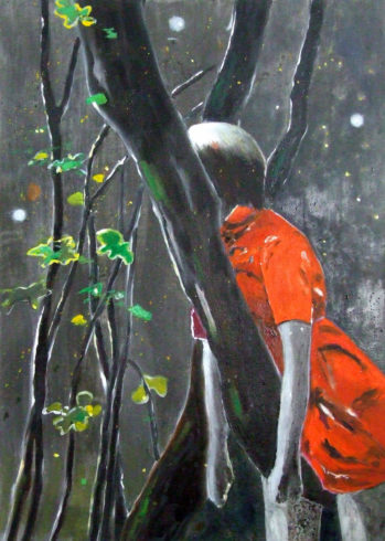 Generell, meist handelt es sich bei den Akteuren in Tanja Vetters Malerei um Kinder. Mit der Vorstellung von Kindern verbinden wir in der Regel Unschuld und Spieltrieb. Inmitten des Waldes verorten wir sie in den klassizistischen und romantischen Traditionen. Als Repoussoirfiguren, die in die Bildtiefe gewandt sind und die wir also nur von hinten sehen, kennzeichnet sie aber auch eine große Nachdenklichkeit. In dem Bild Die Rast (2012) hängt ein Mädchen im roten Kleid weggedreht vom Betrachter in einem Baum. Es bleibt merkwürdig passiv, ja, wie in Trance. Es scheint zum unergründlich grauen Nachthimmel mit seinen weiß funkelnden Sternen zu schauen, an der Seite befinden sich Zweige mit vereinzelten grünen Blättern. Diese wirken in ihrer spiraligen Anordnung wie symbolische Widerspiegelungen von Gedanken und Gefühlen. Bei anderen Malereien trägt das Schaukeln auf einer Wippe oder in einem Reifen, der an einem Baum befestigt ist, zum Eintauchen in andere mentale Welten bei. Überhaupt zieht sich dieses Zusammenwirken unterschiedlicher Sphären von Gegenwart und Vergangenheit, Nähe und Ferne, Faktizität und Einbildung, Bei-sich-Bleiben und Nach-außen-gekehrt-Sein durch das gesamte Werk von Tanja Vetter. Der Landschaftsraum wird zum Resonanzraum des Erinnerns und Wünschens. Eine zeitliche Epoche lässt sich allenfalls an den Kleidungsstücken, bei den früheren Bildern vielleicht auch an der spezifischen Mimik und Gestik bestimmen: als subtile Verweise auf unsere Gegenwart, um die es schließlich immer in der Malerei von Tanja Vetter geht.