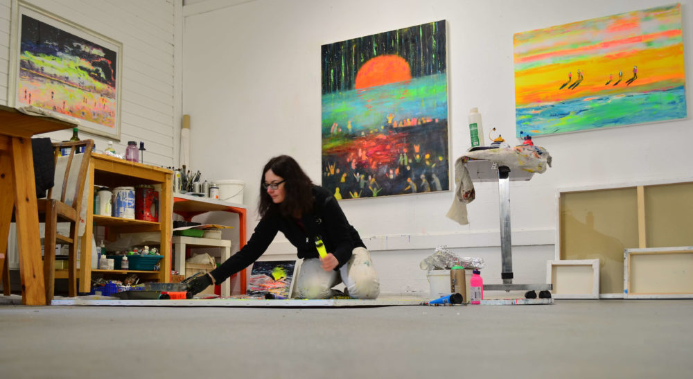 Tanja Vetter muss von ihrer Wohnung in Mannheim lediglich über die Rheinbrücke fahren, kaum zwanzig Minuten dauert es von Haus zu Haus. Das Atelier befindet sich mitten in der Innenstadt von Ludwigshafen. Die vielen Bausünden der Industriestadt im Schatten der BASF sind hier, auf dem Areal hinter dem Wilhelm-Hack-Museum und dem Konzerthaus Pfalzbau, besonders offensichtlich. Das Atelier befindet sich in einem schmucklosen Hinterhof. Dort läuft man auf ein funktional nüchternes Quergebäude zu, eigentlich schon ein Plattenbau, an der rechten Seite geht es eine Eisentreppe hoch, und plötzlich steht man mitten im Atelier. Vom zentralen Raum mit der langen Fensterfront zum Malen geht ein enger Flur ab, der zur Küche und zu einem Bilderlager führt. Aber aller Pragmatismus ist vor den Malereien vergessen. Die Bilder mit ihren Lichtpunkten und den dunklen Zonen rufen Assoziationen an üppige Flora, das Plätschern und Strömen von Wasser, die frische Luft der Gebirge und dessen dumpfes Echo hervor. Tanja Vetter hat immer mehrere Bilder gleichzeitig in Arbeit, die zum Überprüfen an der Wand hängen und nebeneinander lehnen. Auf einer großen Tischplatte liegen etliche Farbtuben, die Pinsel ragen aus Gläsern mit Wasser. Ein paar Fotos liegen beiläufig auf dem Tisch, einige Kunstbände befinden sich an der Seite. Tanja Vetter holt ein Skizzenbuch aus ihrer Tasche, blättert in diesem. Sobald sie mit der Malerei begonnen hat, spielt es als Ideensammlung keine Rolle mehr.
