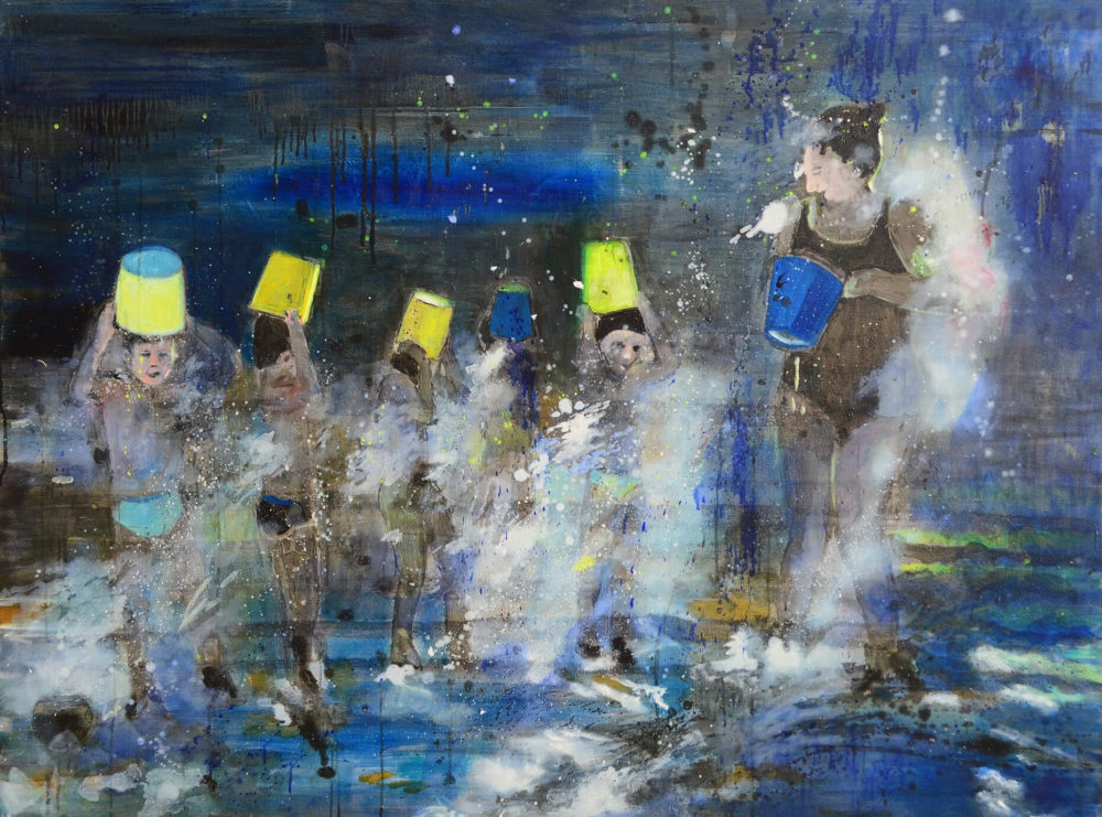 Und doch ist es sehr einfach: Im Mittelgrund einer leeren Landschaft stehen fünf Jungs in Badehosen in einer Reihe, daneben befindet sich, deutlich größer, eine Frau im Badeanzug. Während die Frau im Blick auf die Jungen einen blauen Eimer vor sich hält, haben die Kinder ihren über den Kopf gehoben und schütten ihn jetzt gerade aus, teils sind noch die Unterseiten zu sehen. Die größte Sensation in Water Fun aber sind die vier gelben Eimer, die mit den beiden blauen Eimern korrespondieren und als hellste Stellen im Bild leuchten und dabei wie Lampions im Wind unterschiedlich ausgerichtet sind. Und: Wie wäre es, diese kontrolliert gestische, realistische Malerei als zeitgenössische Fortführung der Tradition des holländischen Gruppenbildnisses zu verstehen und unter diesem Gesichtspunkt – in Bezug auf das Hierarchielose der Kinder, die vertikalen Achsen im jeweils eigenen Bewegungsradius, das Verhältnis von Stillstehen und Aktivität, die Rolle der landschaftlichen Umgebung – noch einmal zu betrachten?