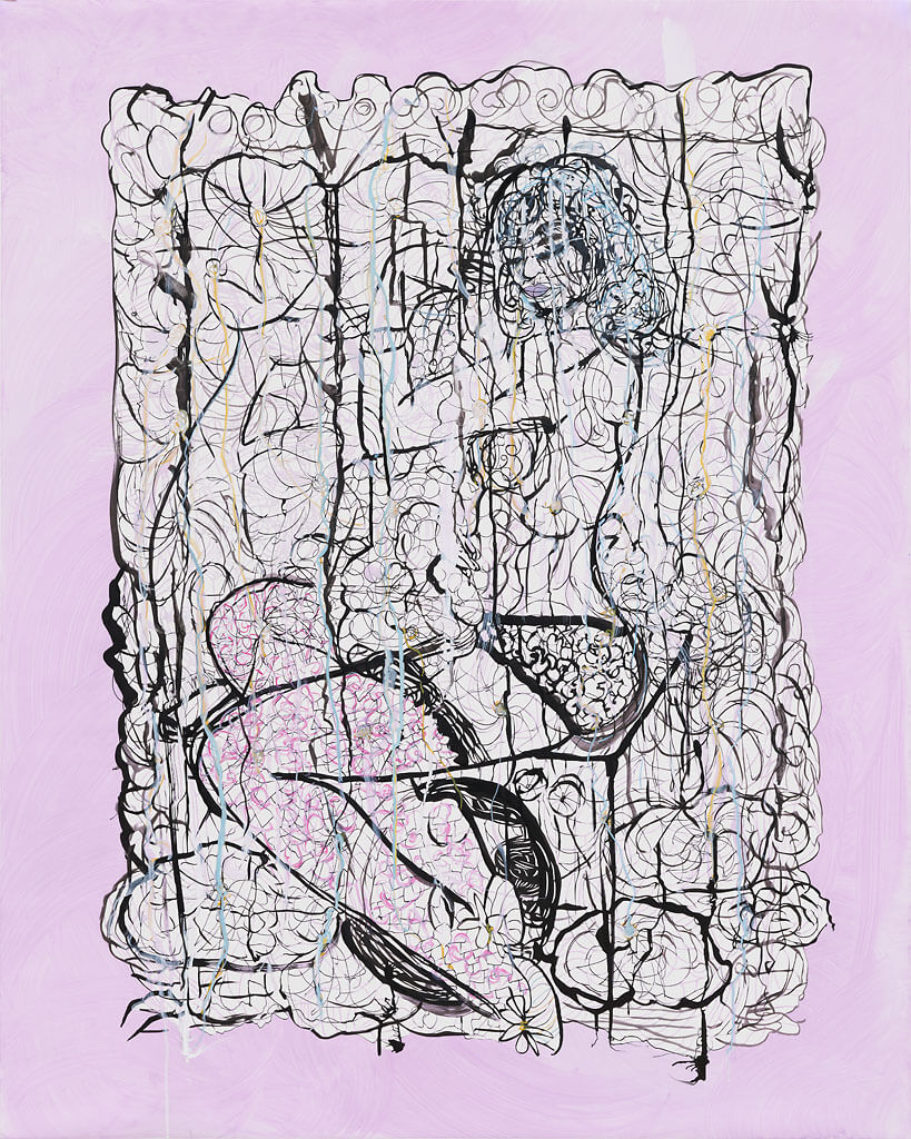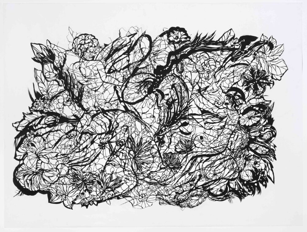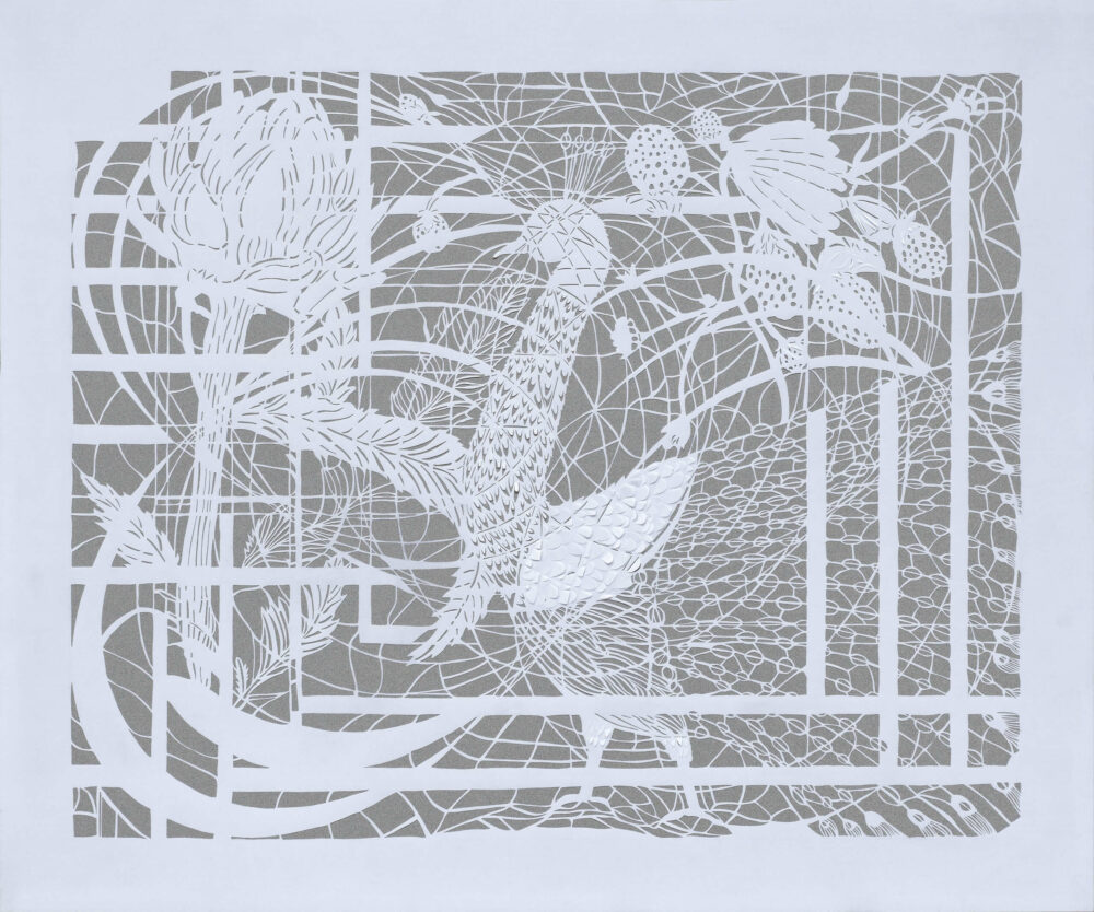 Die Künstlerin verwendet das Papier nicht nur als Fläche für die Zeichnung, sondern als Material der Form. Die Arbeit Magic Forest Peacock von 2020 verdeutlicht besonders die plastische Transformation von Papier. Das zentrale Motiv des Pfaus ist umrahmt von Pflanzen und ornamentalen Linien. Der Vogel ist im Profil dargestellt und bewegt sich zur linken Seite. Speziell sind hier die plastischen Ausführungen der Federn. Das Papier formt die runden Federn und ist leicht nach oben geknickt. Diese plastische Ausformulierung betont die unterschiedlichen Federstrukturen des Pfaus. Diese Technik wiederholt die Künstlerin innerhalb der Darstellung der Erdbeeren. Dort sind die Blätter oberhalb der Früchte plastisch akzentuiert. Diese Arbeit besticht durch die vielen unterschiedlichen Formen. Die Künstlerin überlagert wiederholende quadratische Strukturen mit kreisförmigen und netzartigen Mustern. Sie repräsentieren zum einen Raum und zum anderen lösen sie das Bildgefüge innerhalb der Linie und des Ornaments auf.