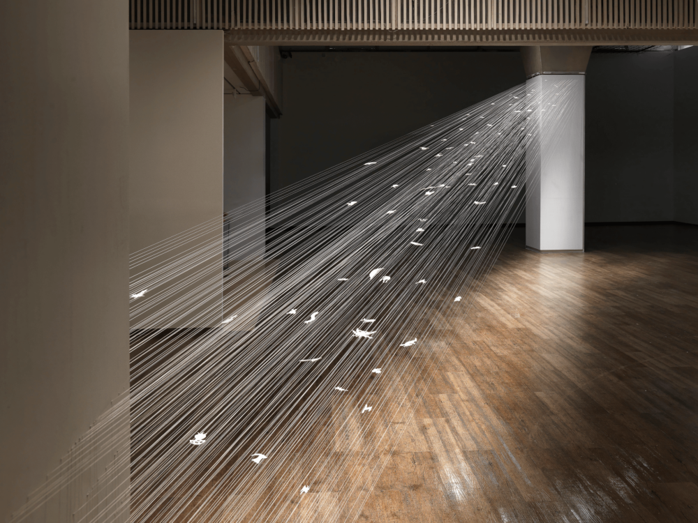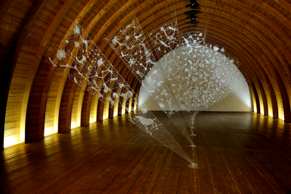 Zipora Rafaelov kreiert für ihre Installationen monumentale Liniengeflechte. Fäden verbinden im parallelen Verlauf Strukturen im Raum. Innerhalb der Linien verknüpft die Künstlerin kleine Figuren und Symbole, welche den Anschein erwecken, im Raum zu schweben. Je nach Perspektive der Betrachtenden entstehen in der Installation unterschiedliche Kombinationen. So ergeben sich neue Dialoge der Motive in Bezug zum räumlichen Verhältnis. Rafaelov gliedert bewusst mit den Fäden den Raum. Im Israel Museum schuf sie 2016 die Arbeit Zerima, indem sie die Fäden mit zwei gegenüberliegenden Säulen verknüpfte. Deutlich ist hier die Auseinandersetzung mit architektonischen Gegebenheiten und der jeweiligen Lichtsituation zu erkennen. Die Arbeit konstruiert eine diagonale Struktur im Museumsraum, indem die Fäden den oberen Teil der Säule verknüpfen und mit dem unteren Bereich des gegenüberliegenden Pfeilers verbinden. Innerhalb des Geflechts von Fäden erscheinen die kleinen Figuren, die als plastischer Schatten aus weiß bemaltem Holz gefasst sind. Sie zeigen Blätter, Sterne und Tiere, wie z.B. eine Schlange, eine Giraffe und einen Wolf. Diese Zusammenstellung erinnert an Sternenbilder mit ihrer individuellen Deutung und Verwurzelung in den verschiedenen Kulturen der Welt. Die vielen feinen Linien im Raum erscheinen geheimnisvoll und ergeben in ihrer Verdichtung eine Dynamik. Die zeitliche Dimension nimmt in den Werken von Zipora Rafaelov eine signifikante Bedeutung ein. Kleine Figuren und Symbole stehen still innerhalb des Geflechts von Linien und visualisieren einen Moment des Fliegens der Objekte. Die Verknüpfung von zwei Säulen im Raum mit den weißen Fäden wirkt wie ein skulpturaler Lichtstrahl mit fliegenden Figuren.