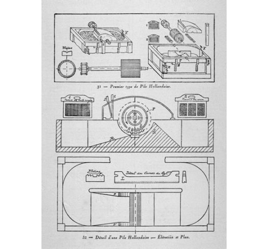 Diese Arbeitsabläufe wurden mit den Erfindungen, die die industrielle Revolution mit sich brachte, tiefgreifend verändert. Schon der sogenannte Holländer hatte um 1670 die Produktivität der Papiermühlen erhöht. Die Maschine kombinierte Schlag- und Schneidewirkung bei der Aufbereitung der Fasern für das Papier. Das steigerte nicht nur die Produktivität, sondern konnte auch, je nach Einstellung der Messer, den Charakter der Papiere beeinflussen.