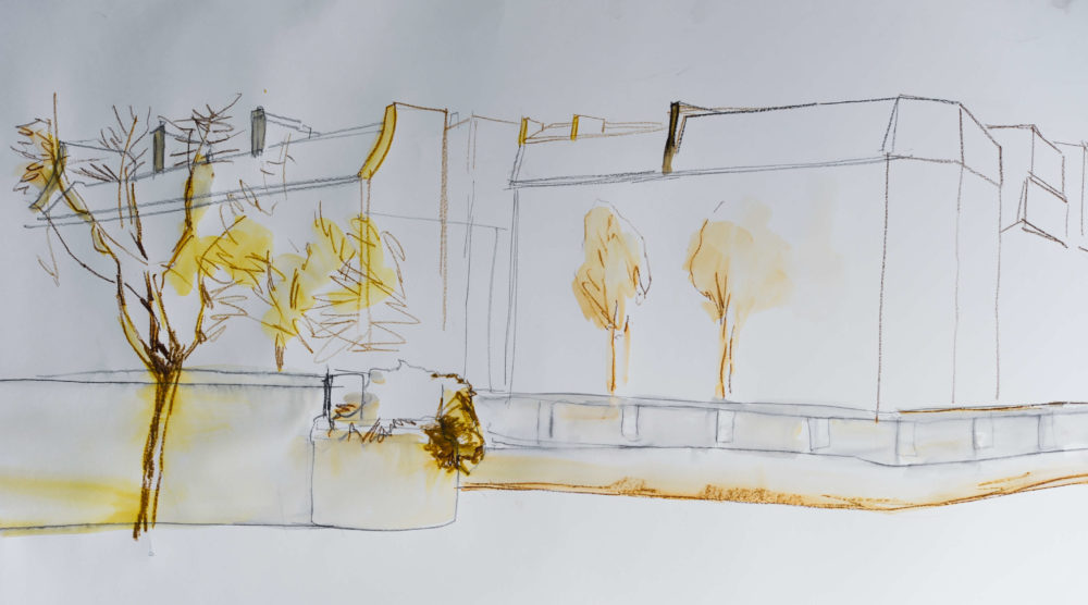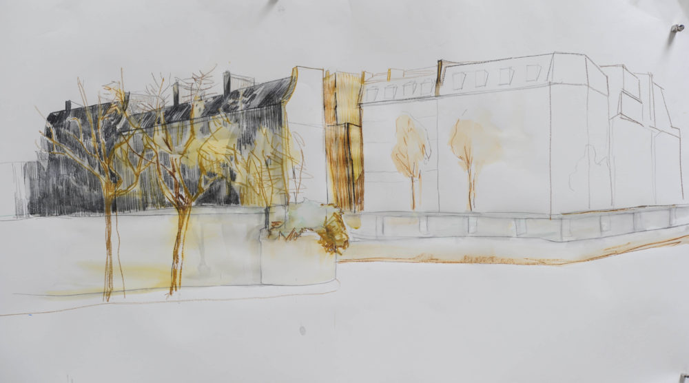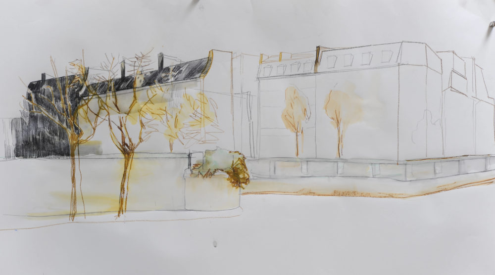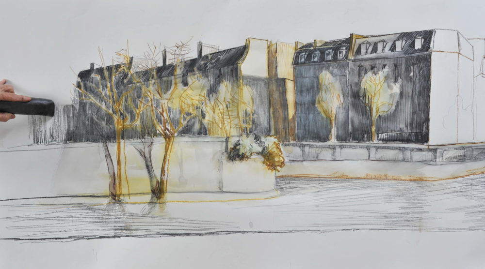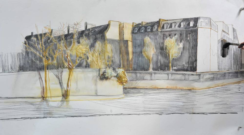 Die Bäume am Seine-Ufer wurden kühn mit minimaler Skizze ins Bild gezeichnet und anschließend laviert, ebenso die eine oder andere Mauerkante.