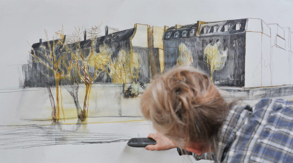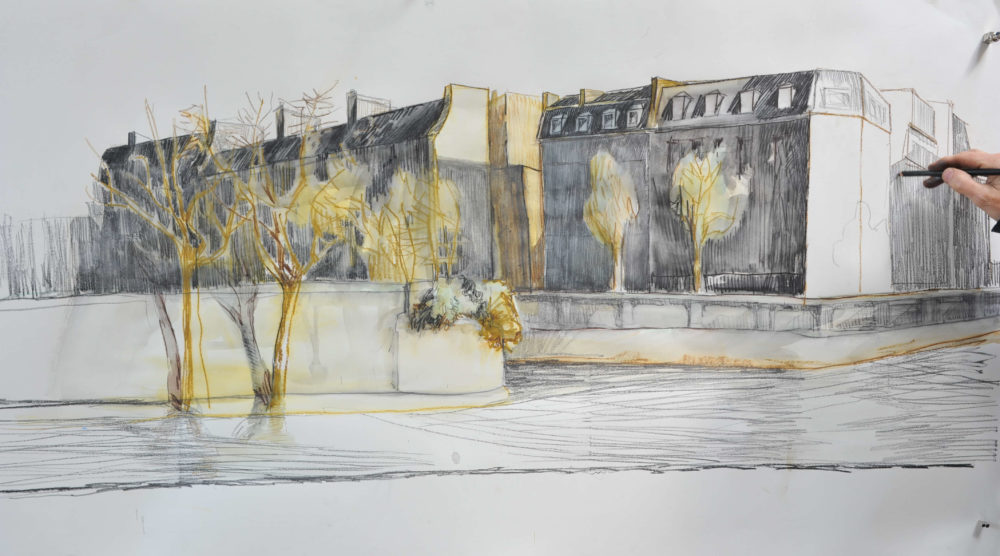 Manche zeichnerische Idee verlangt nach temperamentvollem Ausdruck im großen Format: Für diese Ansicht Pariser Bürgerhäuser am Seine-Kai dient ein großes Blatt Zeichenkarton von der Rolle als Grund. Der Karton verträgt auch eine Lavierung gut und ist hier etwa 130 cm breit.