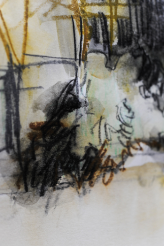 Für sehr dunkle Partien, z.B. die Dächer, wurde der Graphite Stick eingesetzt und mit Pinsel und Wasser leicht anlaviert.