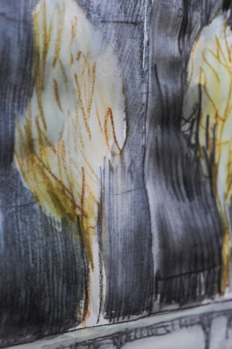 Der leichte Farbschleier im Ocker-Braun-Bereich suggeriert den Baum im Herbst in seinem letzten grüngoldenen Laub. Die leichte Lavierung erzeugt einen malerischen Kontrast vor dem dunklen Hintergrund.