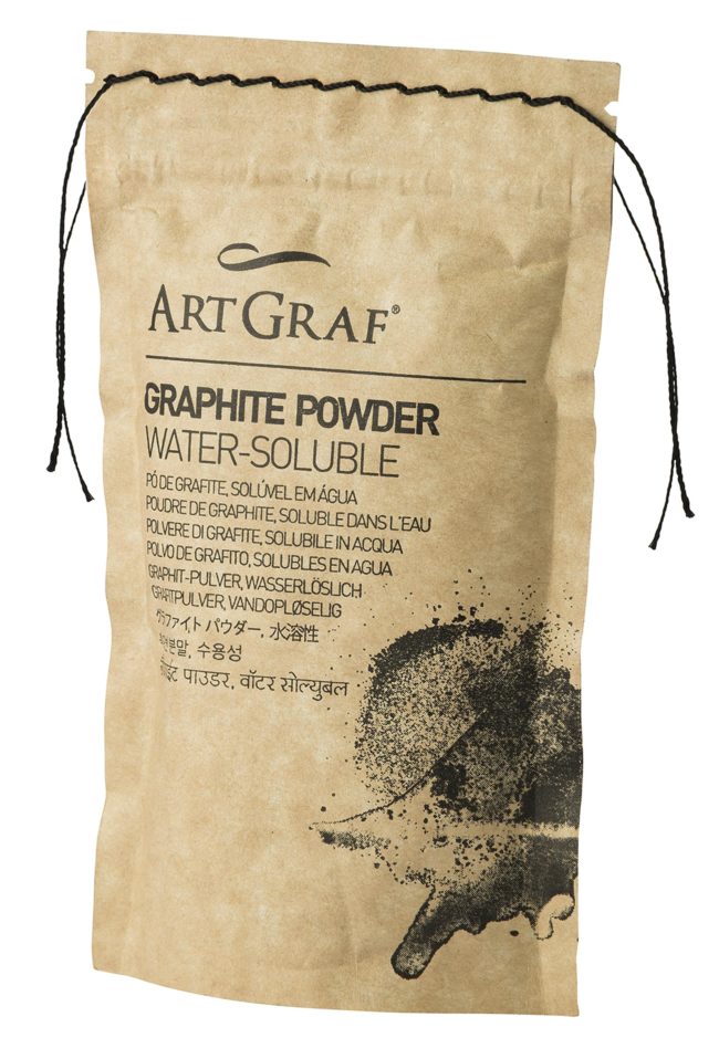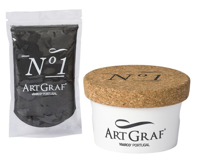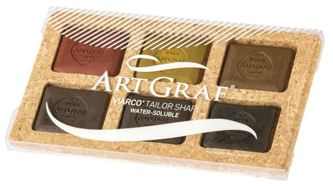 Für die ausdrucksstarke, fast dramatische Wirkung der Zeichnung sind die portugiesischen Art-Graf-Produkte das Mittel der Wahl: Im klassischen Schneiderkreiden-Format, als Stick oder als 250 Gramm schwerer XL-Stick, zusätzlich als knetbare Paste oder gepresstes Pulver eröffnen sie eine Vielfalt an Möglichkeiten. Die Kreiden sind weich und hoch pigmentiert, wasserlöslich und somit bestens für Lavierungen geeignet. Die Palette mit zwölf Farben kommt jedem Geschmack und Sujet entgegen – hier sind es dunklere Töne zur Konturierung und lichtere Brauntöne bei den helleren Partien.