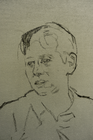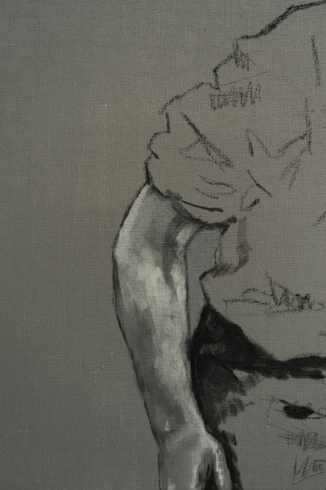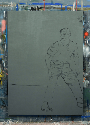 Malgrund für dieses mit 180 x 130 cm großformatige Werk aus der Reihe „Ten ways to create a picture“ ist das rückseitig transparent grundierte Jutegewebe „Natura“. Es wurde mit anthrazit pigmentiertem Kreidegrund grundiert, um einen stumpfen, sehr neutralen und dabei gut saugenden Malgrund für die Ölmalerei zu bekommen. Die Vorzeichnung ist mit Kohle angelegt.