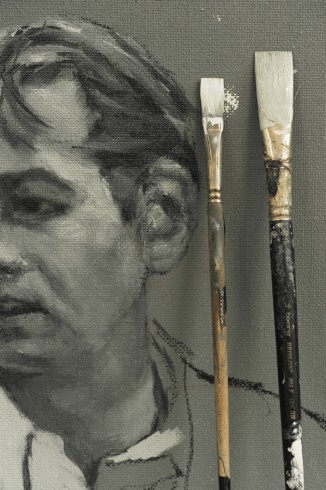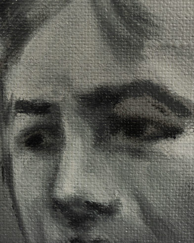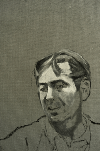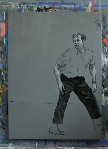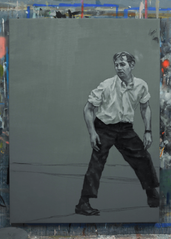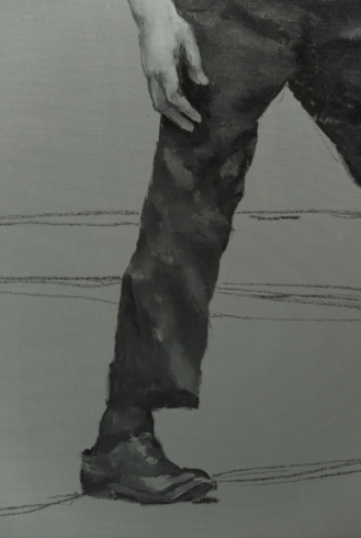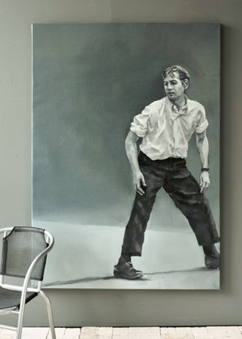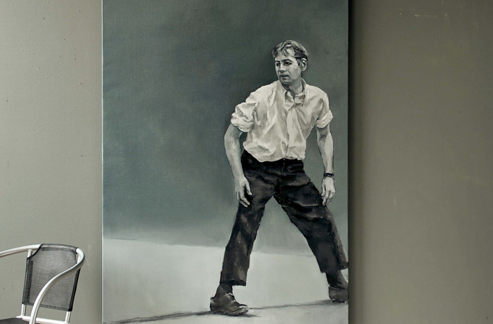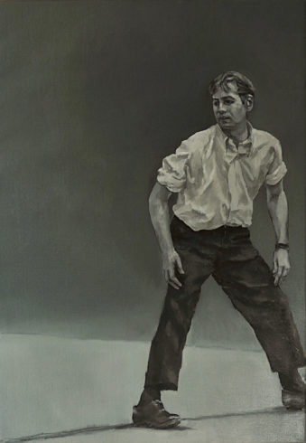 Eine Sekunde, eingefangen aus dem Schwung der Bewegung, erstarrt wie plötzlich eingefroren und aus allen erzählerischen Zusammenhängen gelöst: Der Protagonist verharrt in Aufmerksamkeit. Warum? Und vor allem: Wer ist noch mit im Spiel? Das in Schwarz-, Weiß- und Grautönen gehaltene Männerporträt gibt dem Betrachter Rätsel auf: Wohin richtet sich der Blick des Dargestellten, der in weißem Hemd, schwarzer Hose mit passenden Socken und polierten Schuhen fast sonntäglich gekleidet ist? Gesichtszüge und Haltung berichten weder von Bedrohung oder Unsicherheit, die hochgekrempelten Ärmel sind leger, doch der Blick ist wachsam, die Haltung unruhig. Was wird als Nächstes passieren?