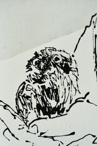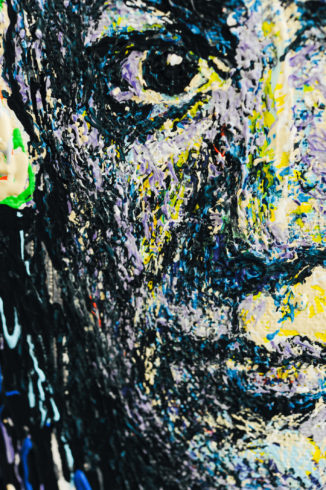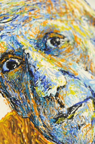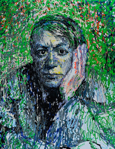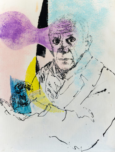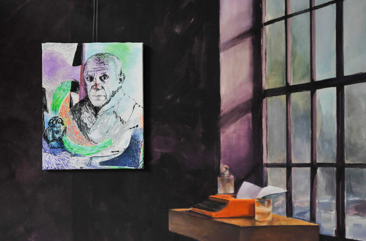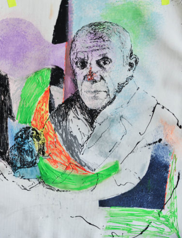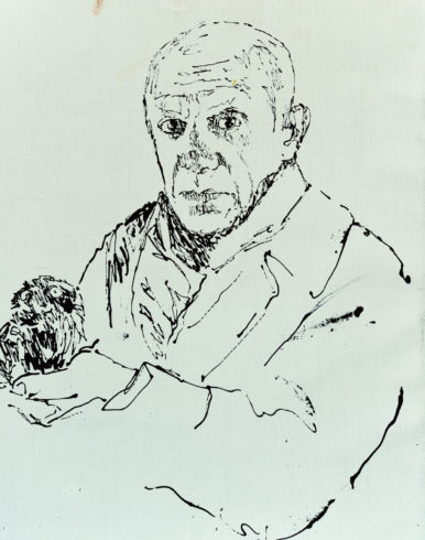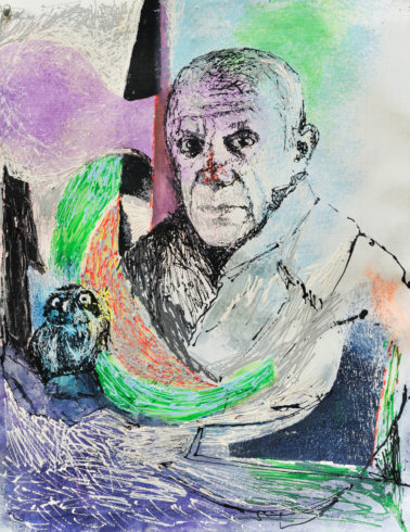 In diesen Zusammenhängen mag das berühmte Foto entstanden sein, das Michel Sima um 1946 aufnahm und das Picasso mit einer jungen Eule auf der Hand zeigt. Es inspirierte zu einem Teil der hier gezeigten Picasso-Porträts, die in Dripping-Technik auf einer auf Keilrahmen aufgespannten Leinwand ausgeführt wurden.