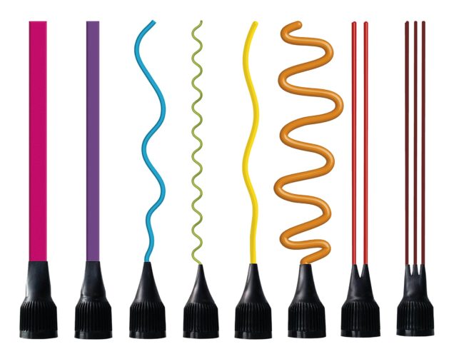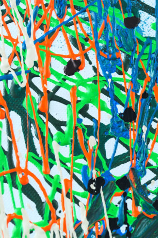 Hier wurde direkt auf der Leinwand gearbeitet, die aber natürlich auch farbig vorgrundiert werden kann. Dazu kamen Acrylfarben zur Anwendung, die in verschiedenen Texturen und Viskositätsgraden erhältlich sind und direkt auf den Malgrund gespritzt bzw. getropft wurden. Für die hochpigmentierten, pastosen Acrylfarben, die in Soft-Packs angeboten werden, sind Zeichen- und Malaufsätze erhältlich, mit denen direkt auf den Malgrund gezeichnet und gedrippt werden kann. Signatur-Aufsätze für Acrylfarbe in Flaschen – einem Fineliner vergleichbar– sind ideal für feinere Linien und Ornamente. Wichtig ist aufgrund der Fließfähigkeit der gedrippten Farben, dass der Malgrund natürlich liegend oder zumindest leicht schräggestellt bearbeitet werden sollte.