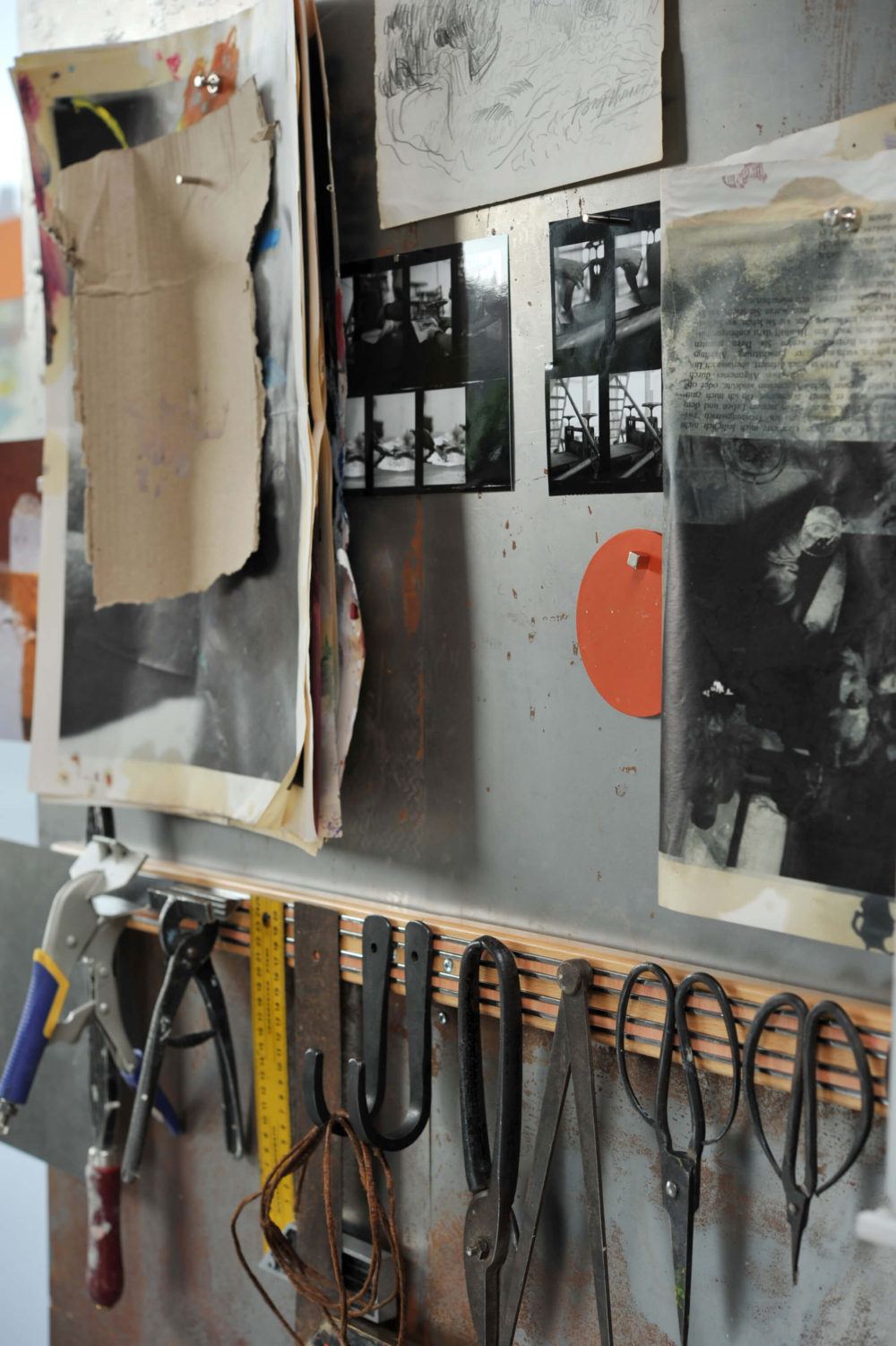 Den Anfang macht zum Beispiel die Magnetleiste, die alles an seinem Platz hält und ideal ist für temporäre Zwecke. An der Atelierwand befestigt und eventuell ergänzt durch Metallplatten mit kleinen Magneten kann solch ein Ensemble zu einer wahren Fundgrube werden: Werkzeuge gesellen sich zu Ideen, Vorlagen zu Farbmustern, Materialproben zu Notizen, Fotos zu Merkzetteln … Der positive Nebeneffekt: Alles wirkt aufgeräumt.