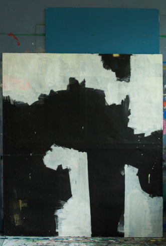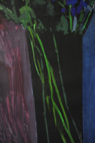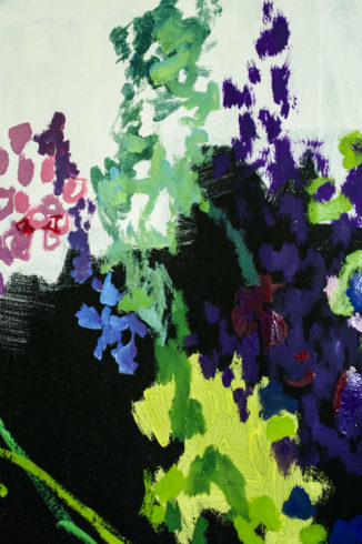 Als Ausgangsbasis dienen kräftige Hell-Dunkel-Kontraste, die schon in der Anlage des Bildes in klarem Wechsel von Taghell und Nachtschwarz greifbar werden. Die große, vormals mit einer früheren Arbeit bemalte Leinwand wurde mit einer kleinen Rolle mit schwarzem und weißem Gesso übermalt und in der Gesamtkomposition angelegt. Diese Grundstruktur bestimmt maßgeblich die Farbwirkung der Blüten – sie stehen teils auf hellem, teils auf dunklem Grund. Zur Ausführung verwendet wurde reine, eher trockene Acrylfarbe mit wenig Wasser.