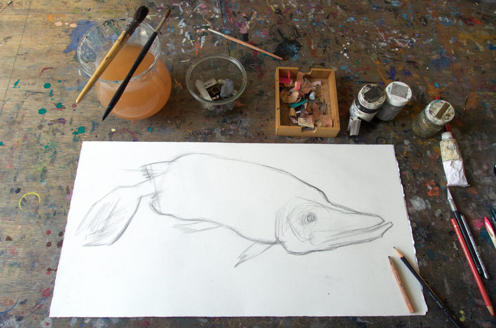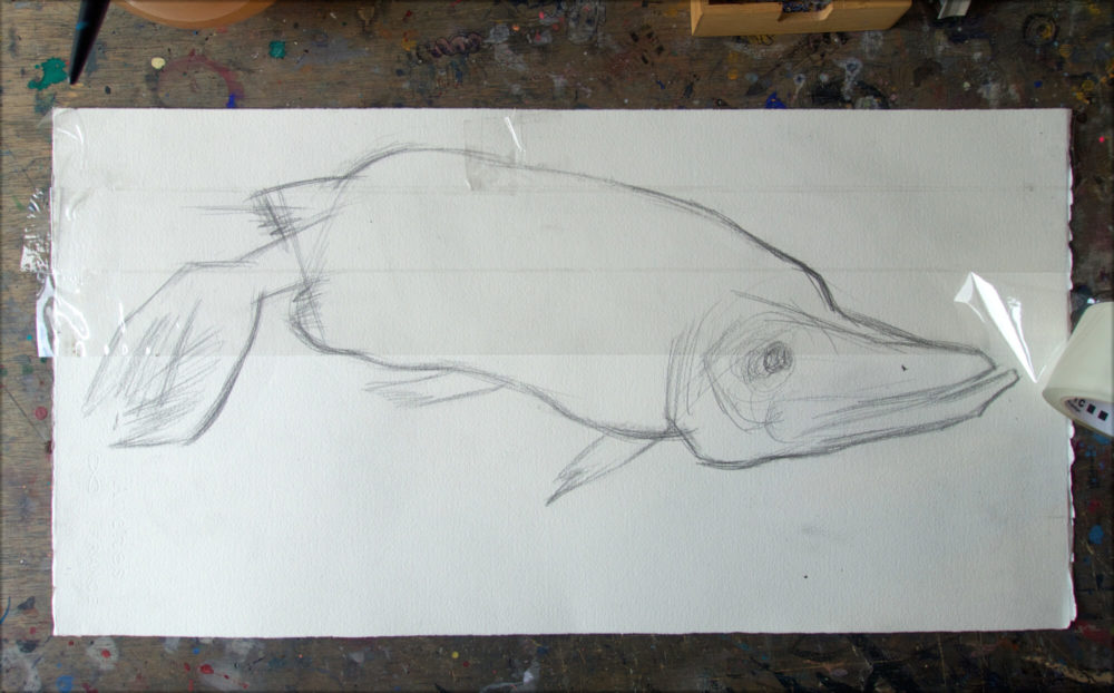 1. Als erstes zeichne ich das Motiv, in diesem Fall einen Hecht, mit Bleistift vor. Der Umriss reicht, denn die Vorzeichnung wird gleich deckend übermalt. Aber bevor es geschieht, kommt der eigentliche Clou: Man klebt das ganze Blatt mit einem transparenten Paketband zu.